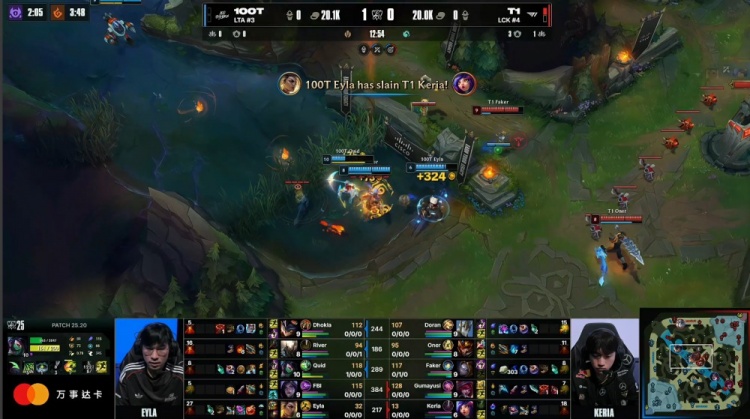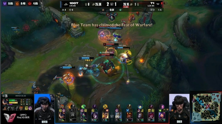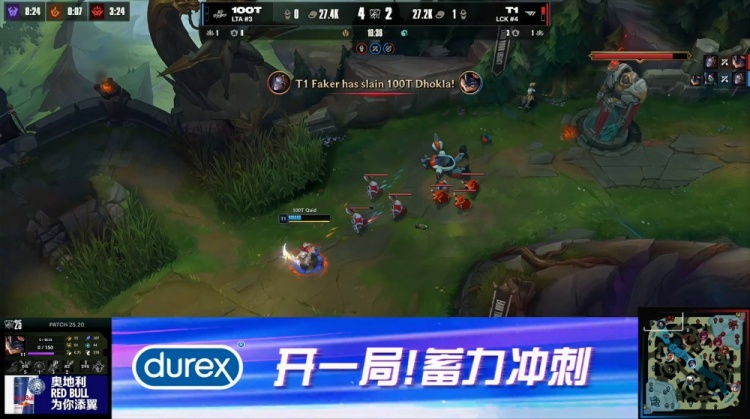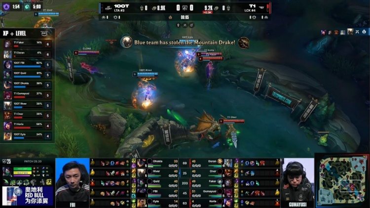 [25:02]大龙团,小吕布走位失误击杀Eyla后被River潘森击杀,T1打出1换3,推掉100T中路一塔与上路二塔,经济领先4k。