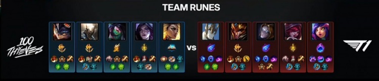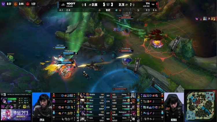 [18:27]100T入侵T1野区,Keria妮蔻先被击杀,多兰加里奥英雄退场,Eyla芮尔也被击杀,双方辅助互换,经济持平。