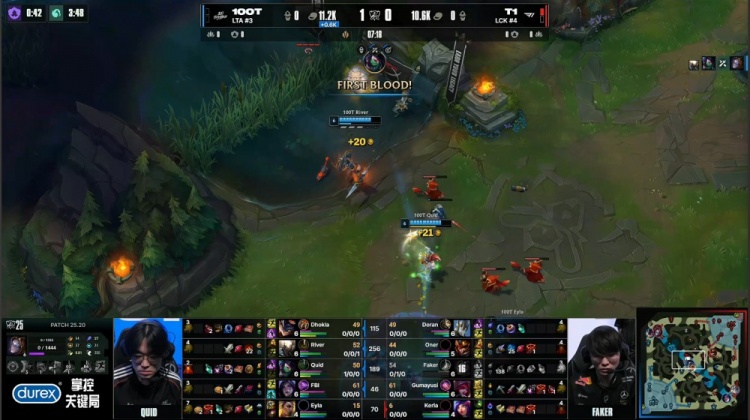 [7:12]River潘森跳大来中落地直接控住Faker发条,Quid阿卡丽跟上吃掉Faker一血。