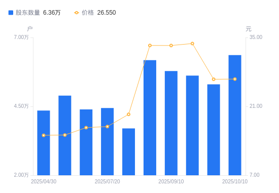 日期A股户数(户)流通A股户均持股数(股)户均持股市值(万元)2025-10-10636358309.6922.062025-09-30529899979.1826.452025-09-20561889411.0331.782025-09-10578079119.4630.432025-08-31617898531.7628.482025-07-313698414253.9727.622025-07-204442011867.8220.062025-06-304389612009.4920.032025-05-314892510777.3616.362025-04-304349912088.5618.28
