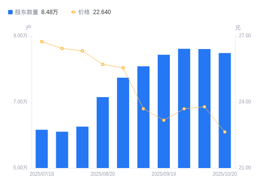 日期A股户数(户)流通A股户均持股数(股)户均持股市值(万元)2025-10-208480116427.2737.192025-10-108603116192.4138.512025-09-308609116181.1238.332025-09-198428816527.2538.292025-09-108080517239.6440.842025-08-297733518013.1846.022025-08-207146719492.2050.112025-08-086252922278.4558.642025-07-316099322839.4960.362025-07-186159022618.1160.48