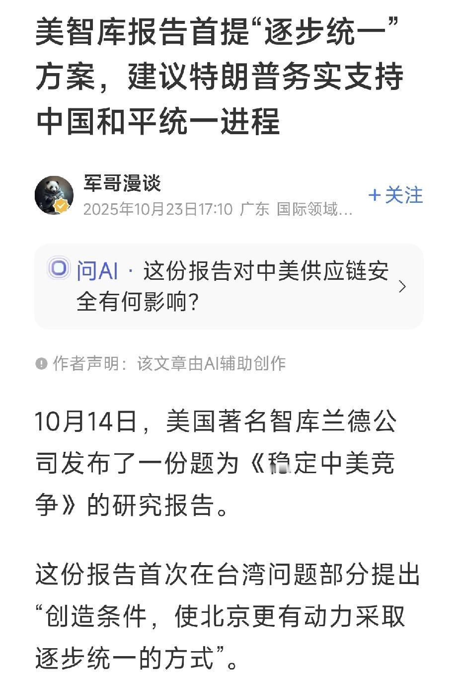 四中全会聚焦推进祖国统一大业!此事并非易事,美智库着重指出中方首次提及“逐步统一”,提醒特朗普秉持务实态度,切勿误判形势,应支持中国实现统一。长久以来,美方对台湾省的表述仅为“维持现状”,绝口不提“中国统一”。 如今高层明确提出“推进祖国统一”,这彰显出坚定的决心,意在凝聚统一思想,祖国统一大业刻不容缓。