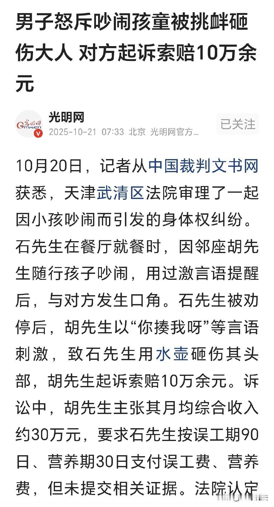 天津,一男子到餐厅吃饭,隔壁小孩不停的吵闹,男子听的烦不胜烦,用过激的语言提醒小孩父亲,要他管教一下自己的孩子,小孩父亲护犊,跳起来和男子吵架,男子被人劝住,本想吃完后赶紧离开,谁知小孩父亲挑衅: 你揍我呀!男子拿起水壶砸他头上,小孩父亲告到法院,说他每个月能挣30万,他要男子赔他误工费营养费10万多元,法院判了! 一家餐厅里飘着香味,客人们来来去去,都在享受着各种美味。 石先生忙碌之后,也是感到了饥肠辘辘,他也来到这家餐厅,随意找了个座位坐下。 石先生点完想要的餐品,没过多久,他的餐品就送了上来。 他忙了一天的工作,这会脑子才放空了片刻,再不用去想班上那些棘手的问题,他细嚼慢咽,难得享受这片刻的安宁。 石先生平时最喜安静,可餐厅之中本来就是人来人往,石先生的座位也是靠边,他就想一个人安静的吃饭。 大多数客人都很有素质,即便是聊天,也都压低了各自的声音。 谁知石先生的隔壁桌上,很快就来了一位男子,这位男士姓胡,他还带着自己的孩子。 谁知那孩子自打坐到隔壁,便也一刻不肯老实,只见他大声的吵闹,一会要这,一会要那。 胡某依着孩子的口味,也要了一些餐品,餐品陆续端上,他们也开始大朵快颐。 谁知那孩子年幼,正是活泼好动的时候,小孩子吃上了几口,便开始大声吵吵闹闹。 小孩子的声音尖锐,顿时充斥着餐厅各个角落,小孩子才不管那么多,吵闹起来压根不顾别人。 只见他上蹿下跳,手脚一刻也不得安宁,他一会拿着筷子在桌子上敲打,一会在又在椅子上踢腾。 食客们投来不满的眼光,可胡某压根就不在乎,任凭小孩子大喊大叫。 可偏偏石先生的餐桌就和他们相邻,石先生离得最近,吵闹声震的他心烦意乱。 那孩子喊着跳着,扒拉着桌子,脚踢椅子,一刻也不消停,声音尖锐,刺的人脑袋轰轰。 食客们虽然不满,可他们离得还是相对的较远,虽然不满,但也没人多说,他们又低下头去继续的吃饭。 谁知那孩子看无人阻止,越发的张狂,越喊越是来劲,可他的父亲胡某仿佛没有听到。 石先生皱了皱眉,这样的孩子他第一次遇到,面前的美食顿时索然无味。 吵闹声越来越大,让他实在无法安心吃饭,他不免心里有些烦躁,觉得在公共场合孩子这样吵闹,家长应该管一管孩子。 于是他放下手中的筷子,转过头去,他带着怒气,提醒胡先生管一管孩子。 而胡某看着自己的孩子,觉得自己的孩子是如此的可爱,竟然有人嫌弃孩子,这人真是多管闲事! 再说了,这里是餐厅,我带孩子来花钱吃饭,这不是你家,你无权干涉我孩子的行为! 俩人顿时吵了起来,服务员赶忙过来劝解,大家都是食客,不要和孩子一般见识,大家都消一消气,饭菜凉了就不好吃。 石先生不再说话,想着赶紧吃完走人,谁知胡某还来了劲了,他不依不饶,大声挑衅: 你有本事,你揍我呀! 石先生忍无可忍,就是这样的家长才能教出来这样的孩子,他气愤难当,抓起水壶砸到胡某头上。 胡某头部受伤,闹的更加厉害,他要石先生等着,这事不能就这么完了! 现场一片混乱,有人报警,救护车和警方立刻赶来。 胡先生受伤,觉得自己吃了大亏,他不依不饶,一纸诉状告到了法院,要求石先生赔偿他10万。 胡某声称,自己月入30万,他要石先生按误工期90天、营养期30天赔偿他误工费,营养费。 可口说无凭,必须要拿出证据,胡某傻眼,他没任何证据来证明自己的收入情况。 法院经过调查,发现俩人都有过错,并不只是表现上的情况。 在这件事中,首先,石先生不应该用过激的言语提醒孩子吵闹,更不应该动手打人。 而胡某在孩子吵闹时没有及时管教,还在事后用言语刺激石先生,这才导致了冲突升级。 那么,这件事在法律上是怎么认定的呢? 《民法典》第1173条规定: 被侵权人对同一损害的发生或者扩大有过错的,可以减轻侵权人的责任。 石先生用水壶砸伤胡先生头部,构成侵权,但胡某以言语刺激石先生,对损害的发生同样存在过错。 《民法典》第1179条规定: 侵害他人造成人身损害的,应当赔偿医疗费、护理费、交通费、营养费、住院伙食补助费等为治疗和康复支出的合理费用,以及因误工减少的收入。 胡某有权要求石先生赔偿其误工费和营养费,但他需提供相应证据证明自己的收入状况和营养期等。 但胡某未提交相关证据支持他的说法,因此法院并未支持按其主张的月均收入30万元来计算误工费及无依据的营养费诉求。 《民事诉讼法》第64条规定: 当事人对自己提出的主张,有责任提供证据。 如果当事人未能提供足够的证据支持其主张,法院将无法认定该事实成立。 胡某主张月均综合收入约30万元,要求按误工期90日、营养期30日支付误工费、营养费,但未提交相关证据。 法院驳回了其无依据的疗养费、js赔偿费诉求。 因此,法院酌定,胡某承担40%的责任,石先生承担60%的责任。 最终,法院判决石先生5日内赔偿胡某3064.98元。
