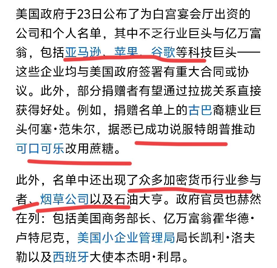 快看!名单曝光了!(图一) 特朗普的“违章建筑”——白宫宴会厅,出资方曝光了:行业巨头、亿万富翁、政府官员……全是富豪! 据说,有人还可以通过拉关系获利。因为这个钱不可能白捐了,总要从特朗普那里得到一点好处吧,一点宽松的政策吧。 值得注意的是,里面提到了资助者有加密货币从业者。我在想大概率就有币安的创始人赵长鹏吧,因为他有违法行为,被判监禁,结果获得了特朗普的特赦![捂脸]
