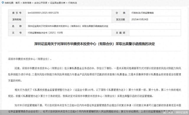 上述行为违反了相关规定,深圳证监局决定对华腾资本采取出具警示函的行政监管措施。