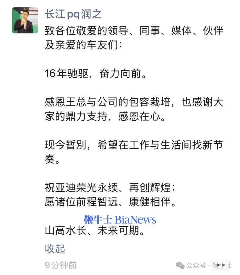 赵长江今日在朋友圈发文宣布离职,并告别比亚迪。