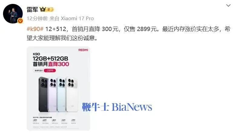 雷军表示,REMIK90“12+512”,首销月直降300元,仅售2899元。