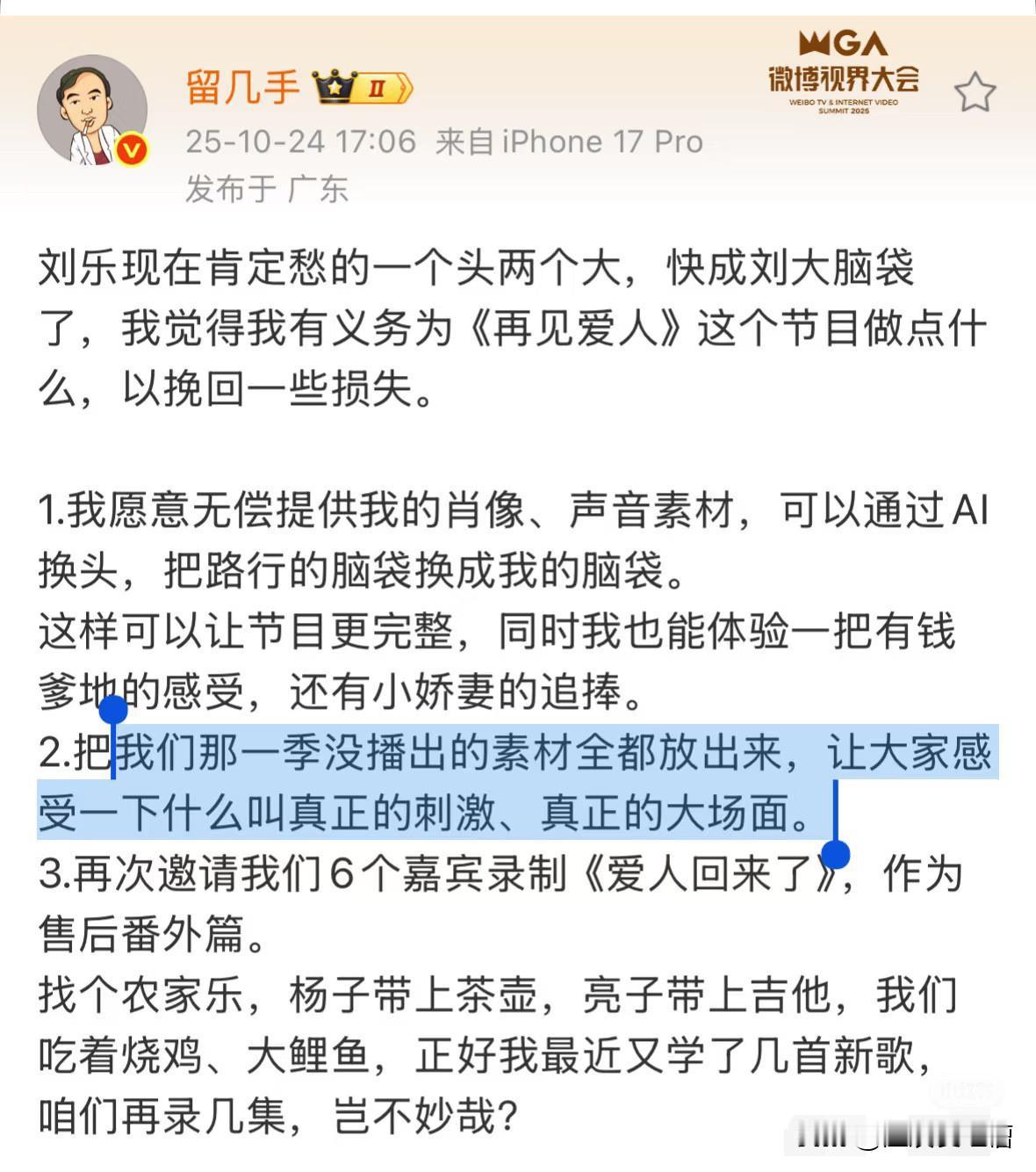 留几手鲨疯了, 再见爱人延播,他就马上出来说话了,完全忘记上一周自己发过视频说再也不聊再见爱人, 直接建议节目组, 喊话导演刘乐, 把上一季他们没播出的素材放出来,让大家感受下什么是真正的刺激,真正的大场面。 什么意思啊? 李行亮这个月才发声明, 说自己和麦林因为这个节目,受了多大的伤, 你们还称兄道弟,和麦林彻夜深聊, 转眼就忘记了? 咱也不能为了流量, 就啥话都说啊。 看来你去年节目是没上到位的, 心灵类节目,是毫无成长, 都一年了,啥都应该放下了呀, 你们说对不?