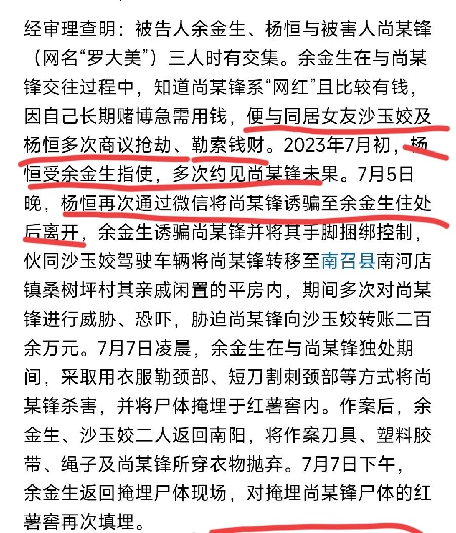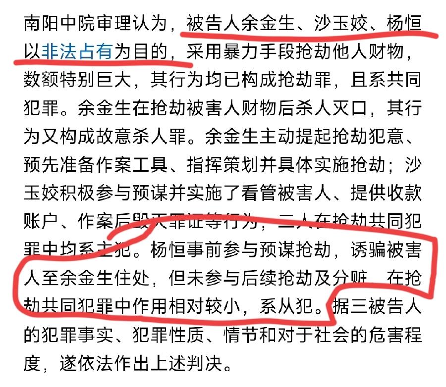 杨恒被判13年,从犯,有3个疑问: 1、为什么杨恒没参与后续分赃?那为什么骗罗大美出来?还与余金生多次商议绑架抢劫? 2、杨恒与余金生、罗大美,分别是什么关系!为什么会帮余金生害罗大美? 3、一审判决为什么认定杨恒是从犯?在抢劫共同犯罪中作用相对较小?没有杨恒骗出来,罗大美能被绑架吗?杨恒不是源头吗? 所以,对于杨恒的判决,罗大美家人不认可,很正常!家人已提出上诉,看后续!