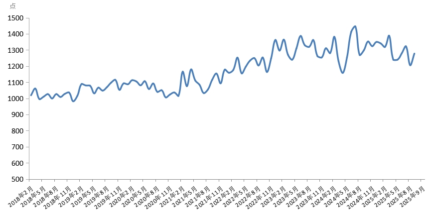 新华财经北京10月24日电(陆子琛、蒋正阳)2025年9月份,新华·中盐食用盐(商超)价格指数报1277.76点,较上期(2025年8月)上涨71.93点,涨幅5.97%;较基期(2018年1月)上涨277.76点,涨幅27.78%;较周期内最高点1445.75点(2024年7月)下跌167.99点,跌幅11.90%;较周期内最低点981.91点(2018年12月)上涨295.85点,涨幅30.13%。