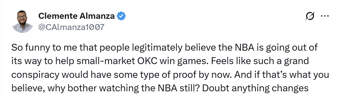 随后,雷霆记者ClementeAlmanza发推质疑外界关于“联盟照顾雷霆”的说法: