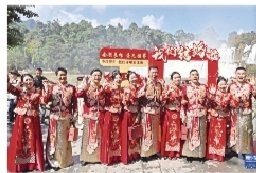 点评:30余对中越夫妻一起在跨国瀑布前共誓终身,爱情无国界的浪漫跃然眼前,集体婚礼也成了“中越人文交流年”的甜蜜注脚。