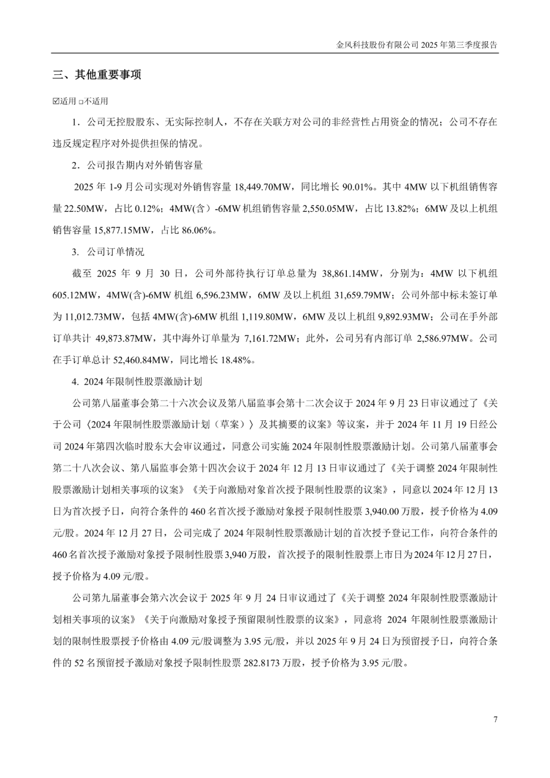 对外销售容量情况方面,金风科技财报指出,2025年1-9月实现对外销售容量18,449.70MW,同比增长90.01%。其中4MW以下机组销售容量22.50MW,占比0.12%;4MW(含)-6MW机组销售容量2,550.05MW,占比13.82%;6MW及以上机组销售容量15,877.15MW,占比86.06%。