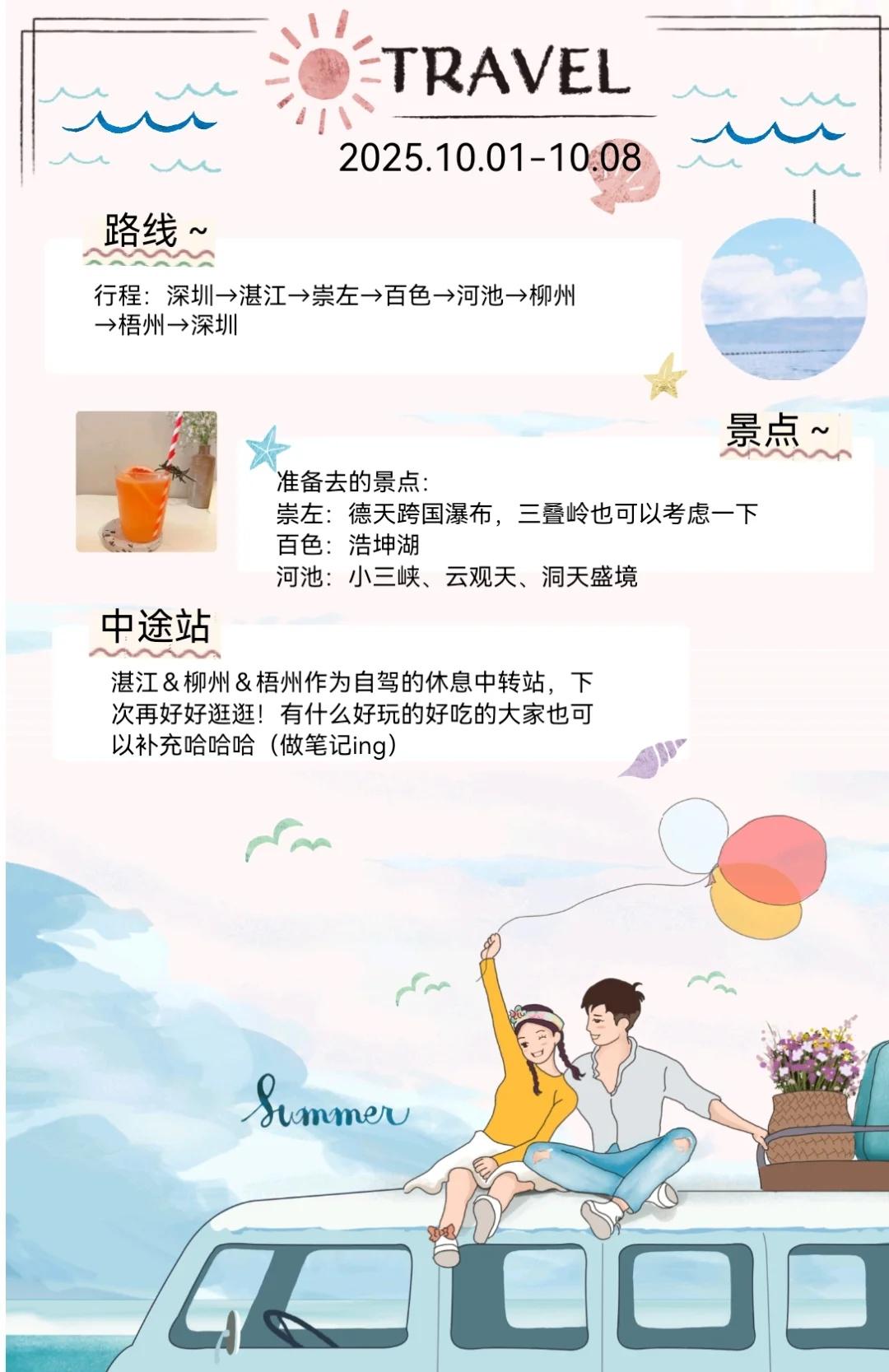 国庆旅游的小众路线~ 今年国庆我们选择了自驾游,为了避开人从众……选择了离广东很近的隔壁省——广西省哈哈哈!毫无悬念第一天和最后两天返程高峰还是堵堵堵堵……不过一家老小中途的行程还是挺开心的! 🚗自驾路线:深圳→湛江→崇左→百色→河池→柳州→梧州→深圳 📝核心景点:崇左、百色、河池 (因为时间有限,选择了大致想去的景点,大家还有当地好玩好吃的可以补充!) [看]崇左:德天跨国瀑布,三叠岭瀑布 [看]百色:浩坤湖 [看]河池:小三峡、云观天、洞天盛境 --------- 路线:南宁到德天瀑布或者明仕田园,经过雷平镇。就可以走到合那高速还有 G359。在德天瀑布玩完,走S316到大新镇 ----------------- 具体安排: 10.1: 深圳→湛江,450公里,在湛江休息一晚。 10.2: 湛江→德天,大概中午到钦州附近吃个饭。下午从钦州出发去德天,经过合那高速等喀斯特特色景观。在德天瀑布附近住下。 10.3: 早上趁人少游览德天瀑布。下午开车去百色市区,晚上在市区住。 10.4: 上午百色市区→浩坤湖游览,吃过中饭,开车去云观天看日落。晚上开去南丹县城入住。 10.5: 上午:南丹县城到洞天盛境游览,吃过中饭,开车去小三峡游览, 晚上开车到河池市区入住。 10.6:河池→梧州,347公里, 10.7: 梧州→深圳,371公里。 广西真的景色特别漂亮!祖国的大好河山,帧帧都出彩!下次娃大一点带她去川西😄哈哈哈 [耶]时间咻的一下就过了,还有很多地方没有去,广西还有哪里好吃的好玩的欢迎补充~下次继续逛吃逛吃! [撒花]才发现可以发文件了![撒花]试试这个新功能😊把详细的旅游攻略也放文件包里了,需要的宝子可以看看~ 小众旅游路线 小众但好玩的地方 国庆节旅游 小众旅游点 旅游小众城市 避开人流的旅游地 旅游推荐 节假日小众的旅游景点 城市游或者周边游