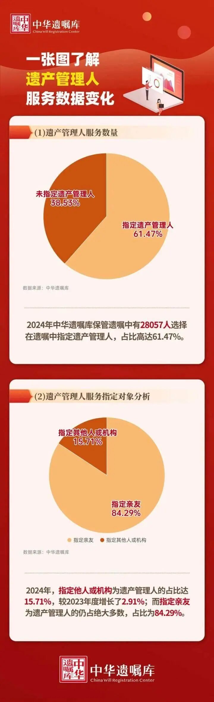 截至2024年底,中华遗嘱库保管的遗嘱中有28057份指定了遗产管理人,占比高达61.47%。其中,指定亲友为遗产管理人的仍为主流,占比为84.29%;但指定他人或机构为遗产管理人的比例较2023年度增长了2.91%,占比达到了15.71%。数据表明,立遗嘱人在财产传承中既依赖传统人际关系信任,也逐步接纳专业化分工。