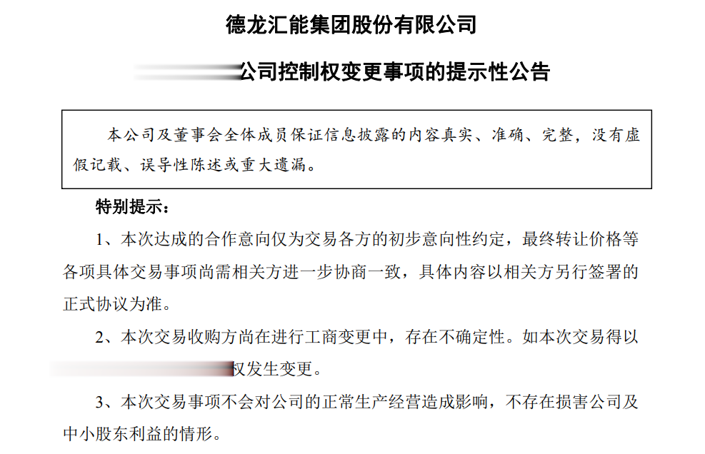 [导读]德龙汇能控股股东拟转让29.64%股份,控制权或生变