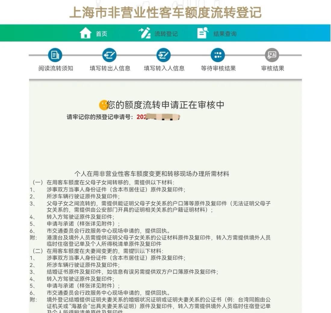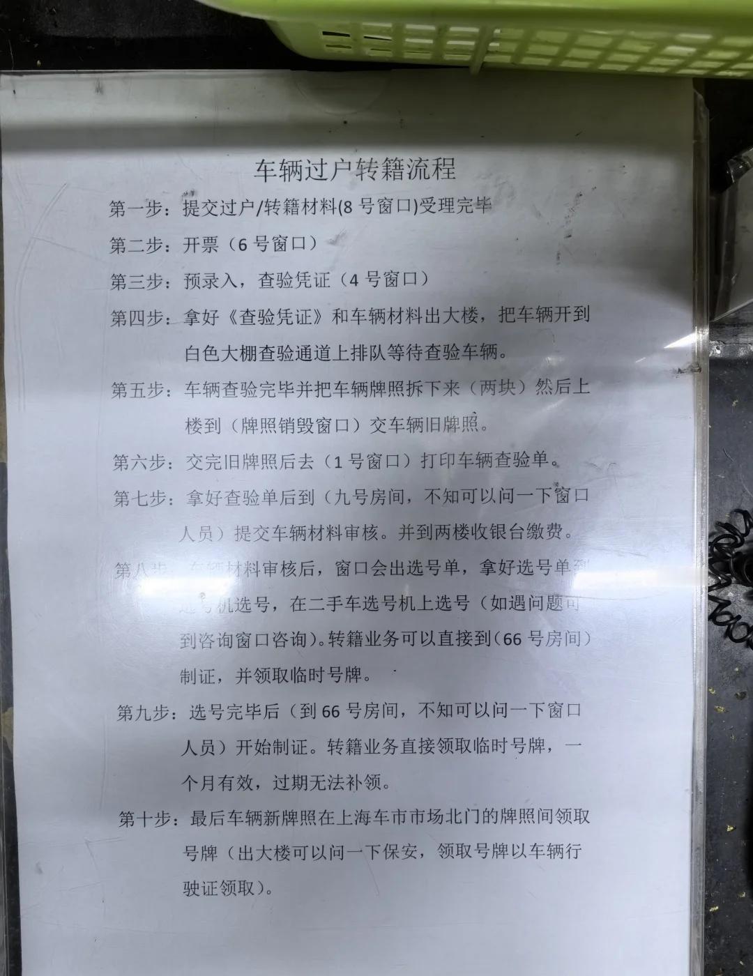 上海沪牌额度流转及二手车过户全流程 昨天一下午用半天时间完成了沪牌过户审批及车辆过户上牌,当天就拿到了新的牌照,非常幸运!! 上海允许亲属(夫妻、父母子女)之间转让个人客车额度,先要非营业性客车额度流转登记,要牢记自己的预登记申请号(P2),一般7个工作日就会出结果,会将结果发送到预留的手机号,但上也有没收到短信的,所以要用申请号来查询。审核通过后需要在1个月之内到建国东路525号市交通行政服务中心领取额度流转的单子。我是结果出来第二天下午就去了,13点一到就在现场扫码取号(时间没到不让取号),取了2号(1号没来,2号就直接办了)。需要双方身份证、车辆行驶证和户口本(证明亲属关系),全部是原件(准备了复印件,没有收),办完出来13点08分,效率杠杠滴! 随后立马赶到沪南公路的二手车交易市场,大概14点10分左右到的,先去3楼8号办理审核(P5是具体流程,非常详细,方便自己办理)现场全是中介,就我一个自己办的[汗][汗],中介就多收100元跑腿费,办理过程中还获得了一个中介小姐姐的帮助,非常感谢!![飞吻][飞吻] 上下家先在微信小程序“车服能手”把资料填一下,现场会让你填申请表,8号窗口-6号窗口(开票)-4号窗口分别办完后,缴费、拿着验车受理凭证把车开到白色棚子那里去验车,当天车还不少,等了有30分钟左右(此处提醒,有工作人员会帮忙卸牌照,如果找了中介就不用付费,自己办的卸牌照收费20,还需要三脚架),验完车后就回到3楼交牌照(在8号窗口那一排的最里面),4号窗口交验车凭证,过了10分钟左右单子就送到9号窗口(中介都是把所有材料放在一个塑料筐里,因为我自己办,一个中介小姐姐就借给我一个框),刷身份证,人脸识别,签字确认,工作人员打给你一张单子扫码缴费(牌照费110),并让我们抓紧时间,再晚当天可能拿不到牌照,于是飞奔到机器上去选号,20选1,选了个还算顺口的,全部完成大概16点04分左右,工作人员告诉我们16点半可以领车牌,顺便问了一下领车牌的工作人员17点下班,以后就领不到牌照了。 原本以为当天是拿不到牌照的,结果全程都比较顺利,当天就拿到了牌照。整套流程下来其实挺方便,如果不想自己跑的,可以找中介,省的自己弄了。因为当天我和我爸两个人一起去的,缴费和验车分头行动的,所以还算节约时间。 费用清单: 过户费510 牌照费110 卸牌照20 二手车过户