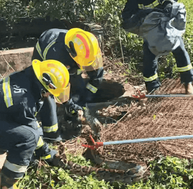 消防员到场后,先用捕蛇夹将蛇头“逼”至开阔处,随后两名队员默契配合,快速夹住蛇头和七寸,仅用5分钟便将大蛇装进了袋子。