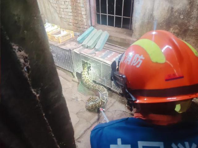 最近,类似的一幕,也在海南上演。据海南消防消息,儋州市大成镇西华农场一位村民家中的鸡舍内,闯入约30斤重的大蟒蛇,蛇身粗壮,如成人大腿。