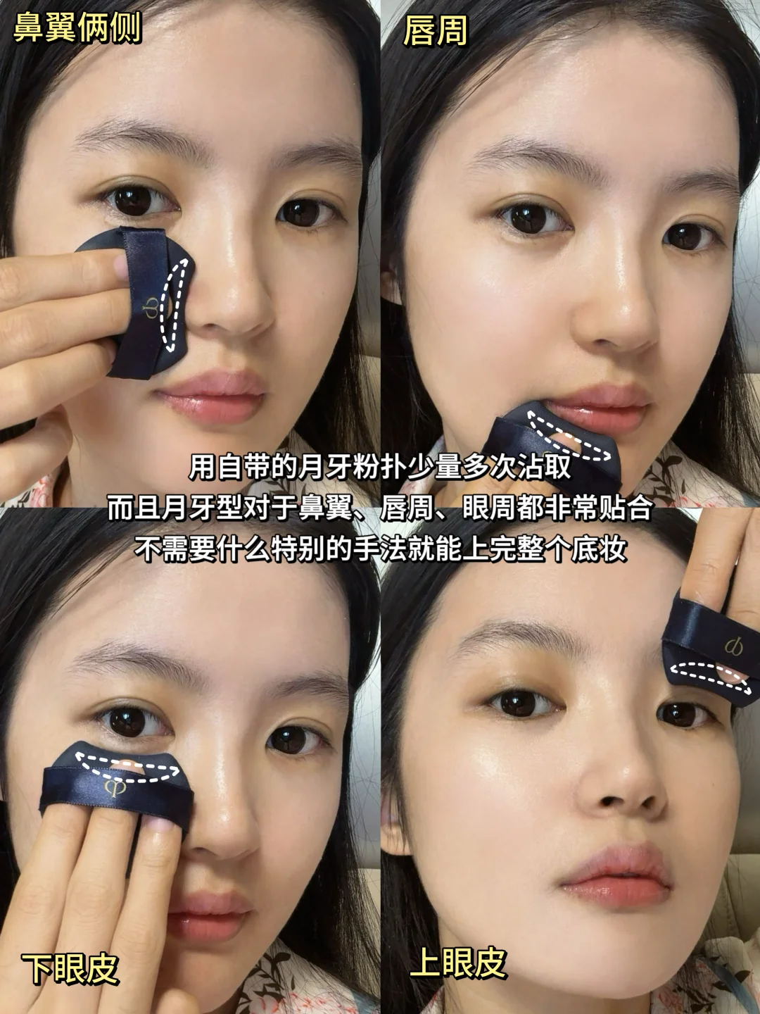 -它自带的月牙型粉扑,非常贴合鼻翼、眼角、唇周等位置。不需要特别的手法就能完成