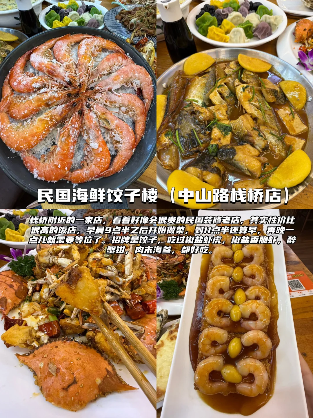 ✅民国海鲜饺子楼(中山路栈桥店):栈桥附近的一家店。招牌是饺子,吃过椒盐虾虎,椒盐香脆虾,醉蟹钳,肉末海参,都好吃。