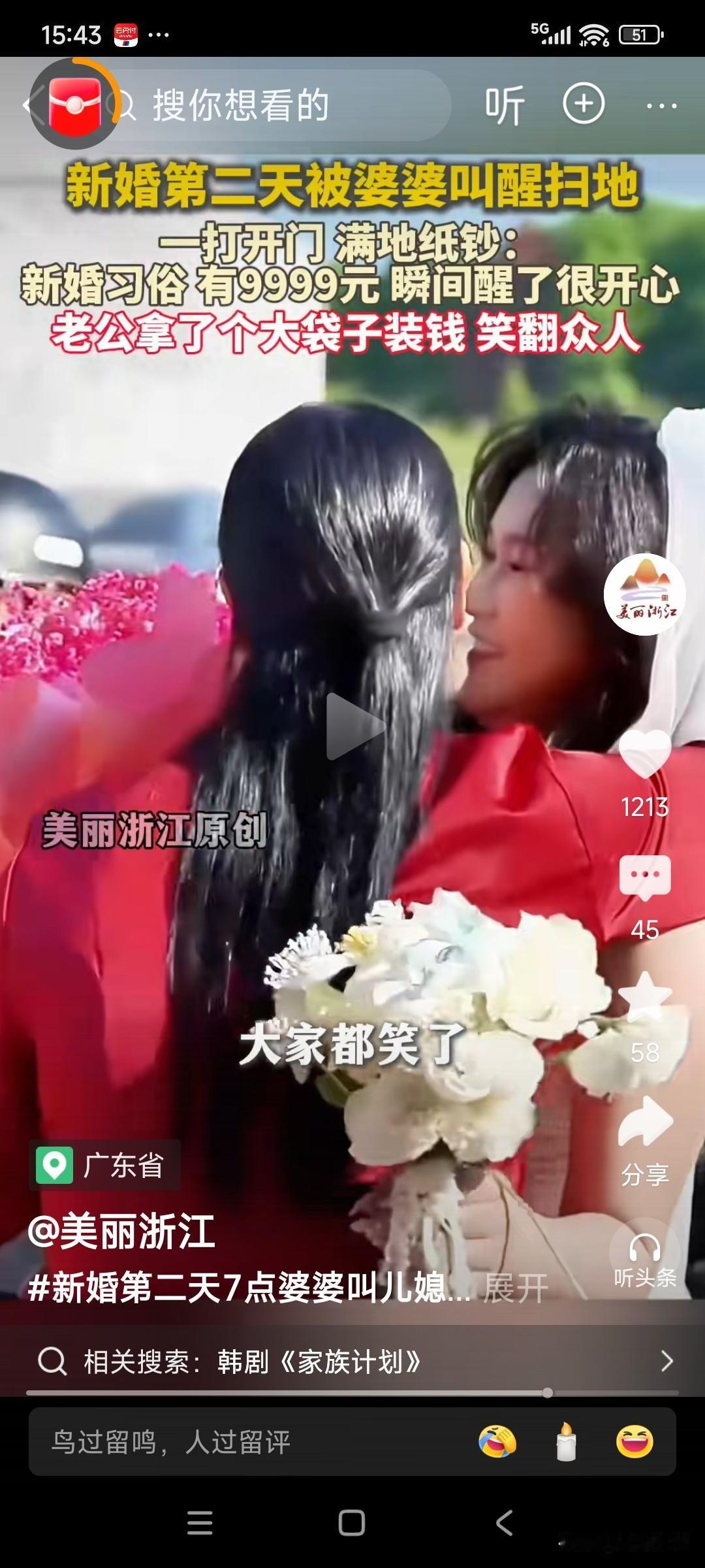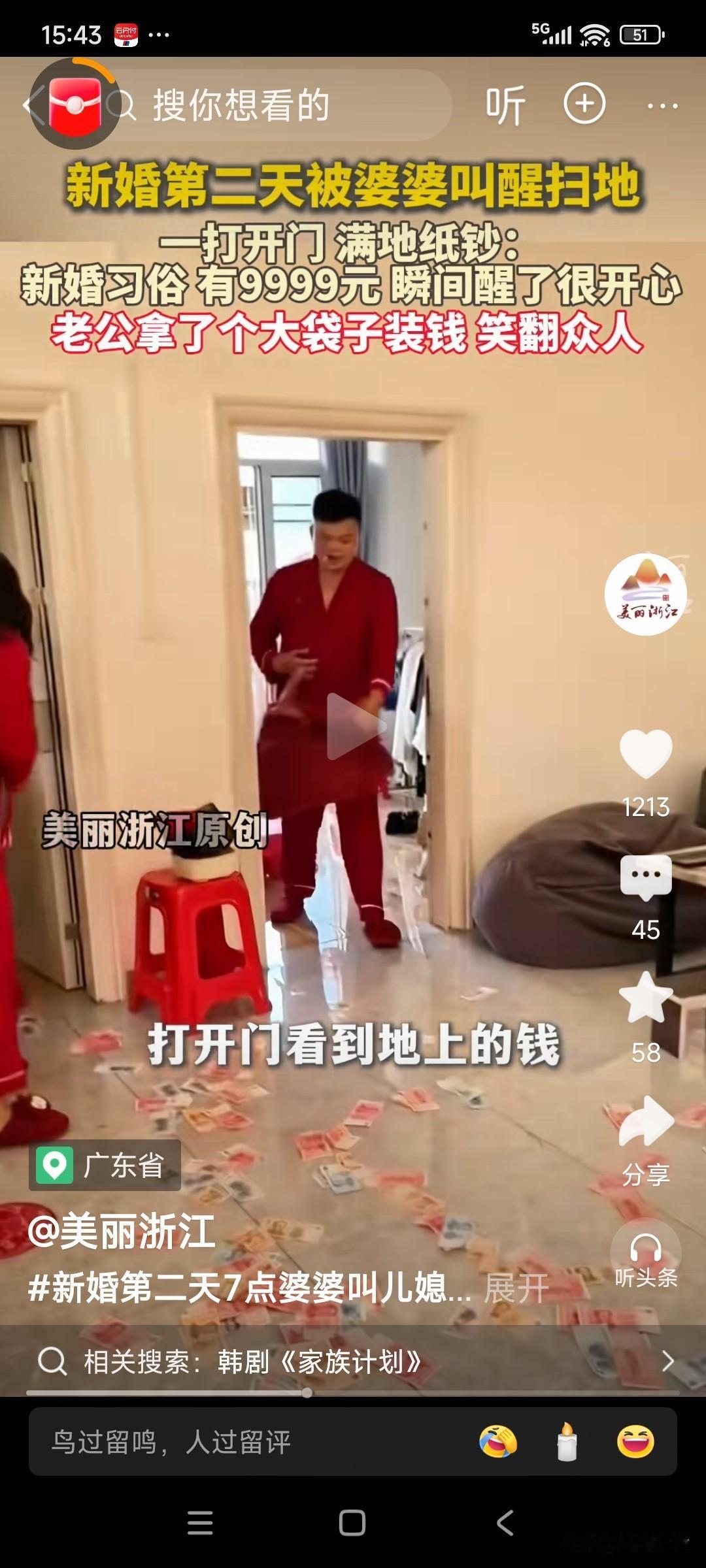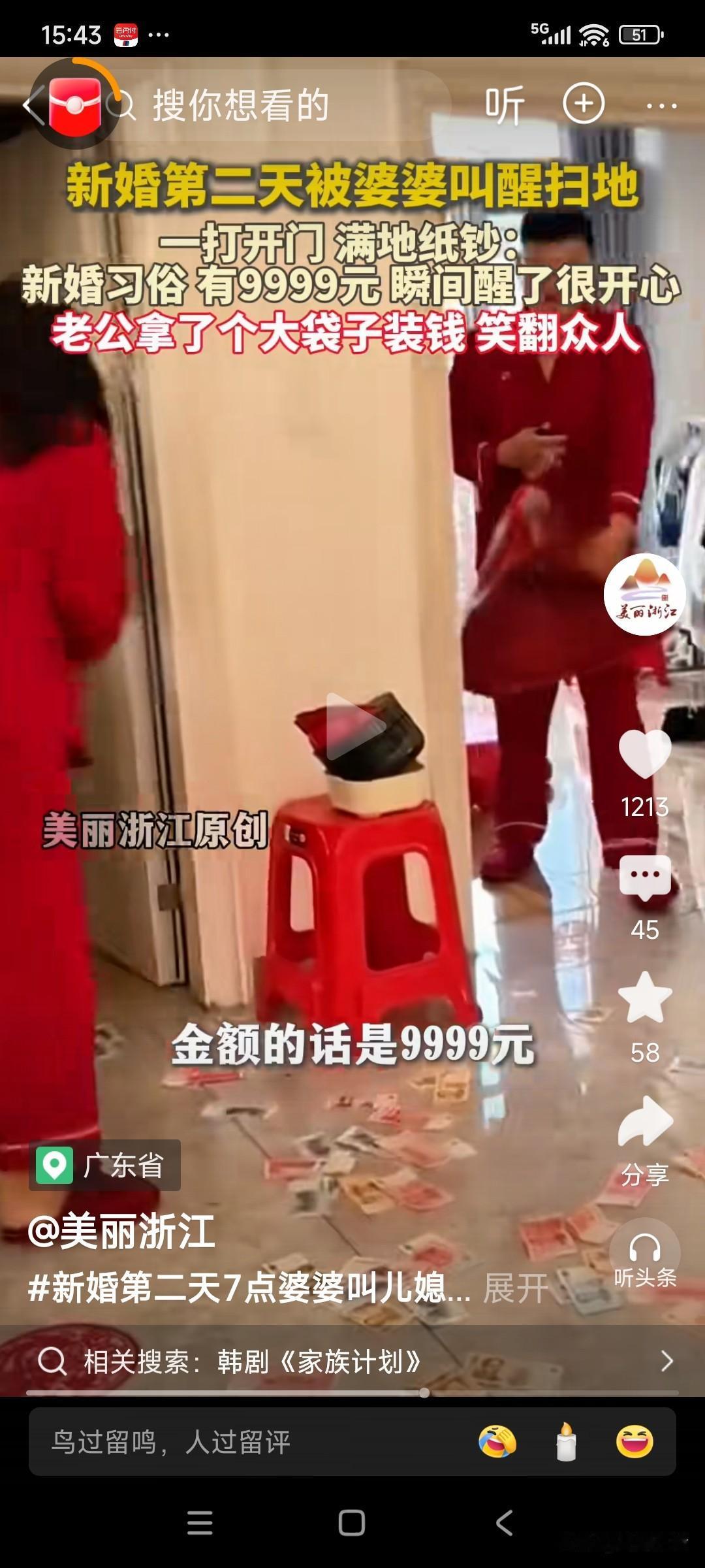 女子刚结婚第二天,早上7点,就被婆婆叫醒扫地,睡的迷迷瞪瞪的,刚打开门,就发现一地的百元大钞,老公拿着大袋子收钱,一脸的骄傲,女子也不好意思的笑着,“扫钱”!一共9999元,预示着“久久远远”,是婆家对一对新人,最好的祝福! 有人说,这是哪里啊,我也想嫁过去,“扫钱”! 太幸福了!