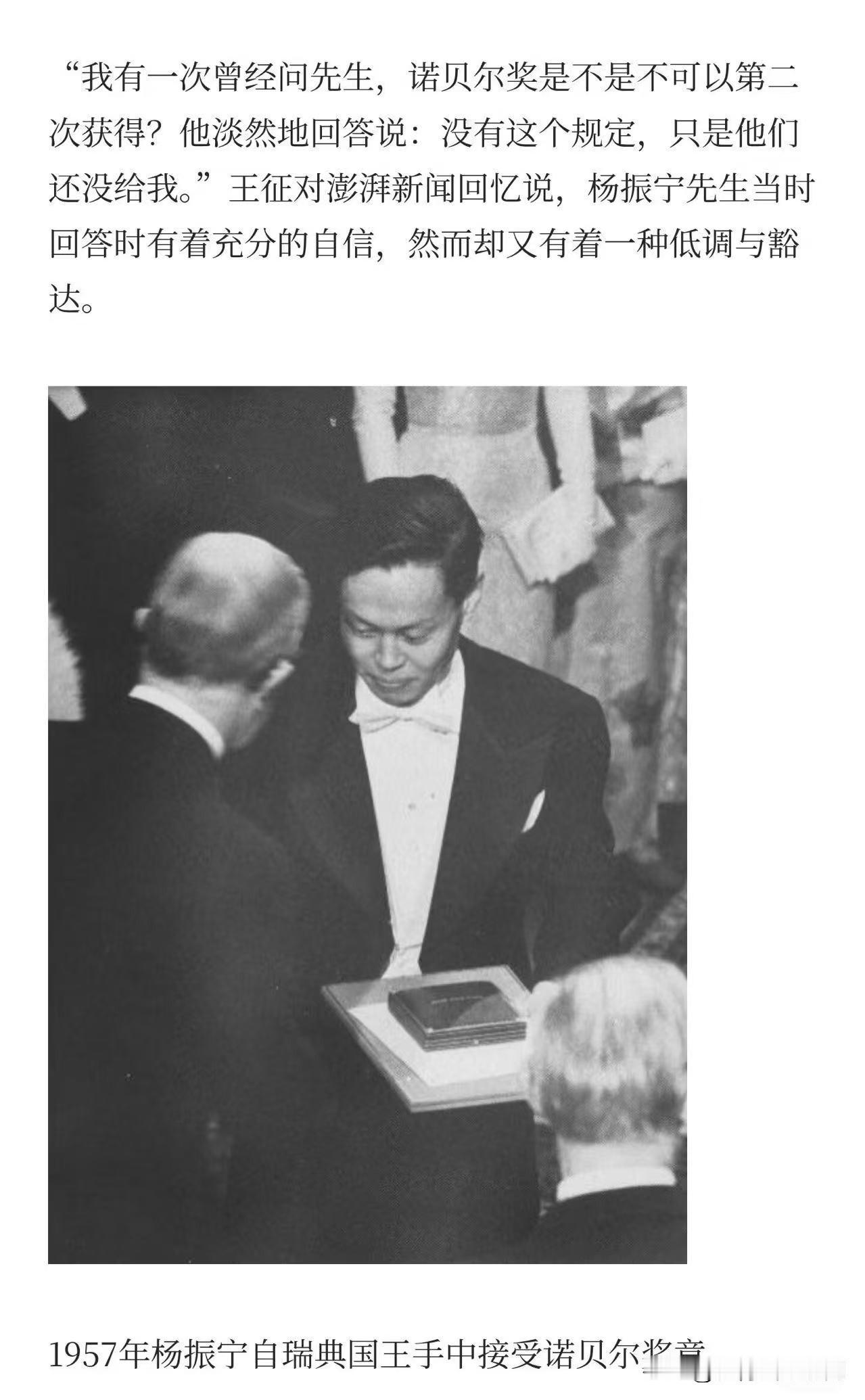 原来杨老还有获得第2次诺贝尔奖的机会,怪不得他有一些遗憾。如果能2次诺贝尔奖,对他来说身份就变了! 第1次获奖,其实他也是中国国籍,不过后来加入了美国国籍,在十几年前才放弃了外国国籍,成为中国公民。 如果第2次获奖他将以中国公民的身份领取,这对他来说意义重大。他的“杨-米斯尔理论”被学界公认具备再次获得诺贝尔奖的潜力,交了材料却一直没有消息。 可惜当时已经年近百岁,就这样错过了,这无疑是十分遗憾的。 宁拙毋巧,宁朴毋华是他常说的一句话。他曾表示自己一生最重要的贡献之一就是用自己的科学研究成果帮助中国人改变了觉得自己不如人的心理作用! 这次告别不是终点,杨老源于骨子里的家国情怀,那些他改变人类认知的学术成就,会作为教科书里的理论和科研人心中的坚守被我们继续传递。 走好!
