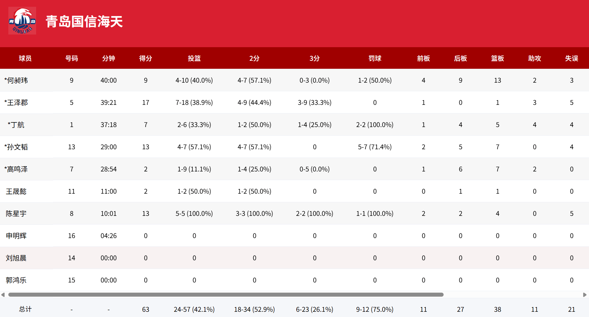 青岛U17:王泽郡17分、孙文韬13分、陈星宇13分