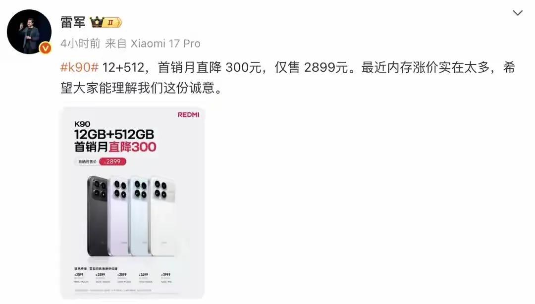 redmik90刚发布就降价,而且是降价300元,这300元可不是小数字,够一些人的一星期的生活费了! 日前小米发布了红米k90手机,说实话看k90的配置还是很心动的,甚至说它大哥小米17很多没有的技术都被用到了,妥妥的是用料扎实,但是价格也实在是有些高了! 要知道很多人认为k90属于中端机甚至是很多人的工作手机,比如我就用的k70来跑外卖,可以说k70除了没有防水和无线充电功能,其他一切都很完美,现在还能继续使用,但是现在k90的价格实在是超出我预期! 不过就在昨天,雷军和红米的卢伟冰纷纷发微博表示,听见了广大朋友的呼声,也愿意向用户靠拢,12gb+512的直接降价300! 这不由得让我想起了苹果的17pro系列也是降价300简直是巧合到了极点! 其实我想说的是对于普通人来说运行内存16gb+才是最实用的!希望这个系列降价! 等我的k70什么时候不能再战我是一定会考虑k90的16+版本,相信那时候也降到了我能接受的价格!