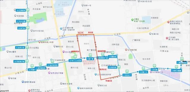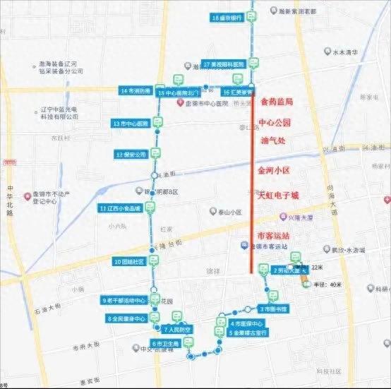整合后站点:1.一品六里2.化工桥3.华锦集团4.华锦销售公司5.花园小区6.辽化医院7.辽化生活区8.锦湖花园9.九化岗10.湖滨公园11.北方工业学校12.盘山县医院13.辽河岗14.食品一条街15.盘锦市中医院16.辽河左岸17.市高中北门18.市高中19.检测中心20.市老年养护院21.盛京银行22.美视眼科医院23.汇美家饰24.市中心医院北门25.市消防局26.市中心医院27.保安公司28.辽西小食品城29.团结社区30.老干部活动中心31.全民健身中心32.人民防空33.市卫生局34.金聚楼古宝行35.市医保中心36.市图书馆37.兴隆台区政府(劳动大厦)38.市人大。