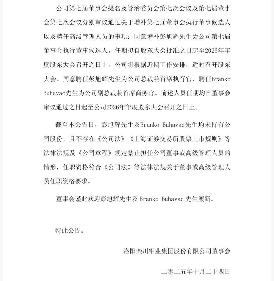 10月25日,洛阳钼业(603993.SH)发布高管任命公告,聘任彭旭辉为公司总裁兼CEO,并推荐作为执行董事候选人,原总裁孙瑞文离职并辞任执行董事。