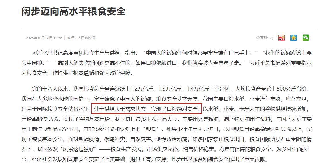 如果全球都停止出口粮食,中国能否自给自足?就这么说吧,中国停止粮食供应,全球至少饿死10%的人口。 上世纪五六十年代那会儿,中国就是人多耕地少,一亩地就打几百斤粮,饿肚子是常有的事儿。后来袁隆平团队搞出了杂交水稻,一亩地的产量从300公斤一下子飙到1200公斤,直接把“吃饭难”这事儿给彻底解决了。 现在中国粮食总产量都连续4年超过1.3万亿斤了,2024年更是突破了1.4万亿斤,平均到每个人头上有500公斤粮食,比世界平均水平还高呢。你知道这啥意思不?就算全球都断了粮食供应,咱中国自己种的粮,也够14亿人吃一年半! 咱国家对粮食安全有俩保险:吃的口粮绝对够,谷物类基本不用靠进口。像水稻、小麦这俩主要粮食,自己种的完全够吃,自给率常年都是100%,库存的粮都够全国人吃一年的。 就说2024年吧,单黑龙江一个省产的粮,就够1.5亿人吃一年,河南、山东这些产粮大省,那更是“粮仓里的粮仓”。就算遇上旱灾水灾,国家还有10亿亩高标准农田兜着呢,这些田不管旱涝都能有收成,一亩地的产量比普通农田高50%。 当然也有要操心的事儿,咱中国每年得进口1亿吨大豆,占了全球大豆贸易量的60%,这确实是个“卡脖子”的点。但也别慌,大豆主要是用来榨油和做饲料的,直接煮着吃的少。 国家早就想好了替代办法,比如给玉米提蛋白,用基因编辑技术让玉米的蛋白含量每提高1%,就相当于少进口700万吨大豆;实验室里做的植物基肉饼都已经上市了,以后喂牲口可能就不用那么多豆粕了;东北、黄淮海这些地方还在推广耐盐碱大豆,预计到2030年,大豆自己能种够30%。 更厉害的是,要是中国不往外卖粮食了,全球至少10%的人得饿肚子!这真不是吹牛:咱每年都出口2000多万吨粮食,占全球粮食贸易量的3%,大米、小麦、玉米这些,中东、非洲不少国家都靠这些过日子。 而且袁隆平团队还在东南亚、非洲教他们种杂交水稻,让当地亩产翻了倍,要是咱不提供种子和技术,这些国家的粮食产量至少得降40%。再说储备粮,咱中央储备的够吃一年,地方储备还能再撑半年,可美国、欧盟那边,储备粮一般也就够吃3到6个月。 现在中国农业也不是“靠天吃饭”了,改成“科技种田”了:无人机施肥、遥感看庄稼生没生病、AI预测产量,一个农民能管上千亩地。种子技术也厉害,用基因编辑让小麦抗赤霉病、水稻耐高温,未来十年主粮亩产还能再提20%。18亿亩耕地的红线抓得特别严,东北黑土地每年都“体检”,退化面积都少了20%。 有人担心全球断粮会让中国闹饥荒,这纯属瞎操心。中国就用全球9%的耕地,养活了20%的人口,靠的不是运气,是杂交水稻、高标准农田、粮食储备、科技攻关这四个法宝。就算大豆进口全断了,咱少吃点肉、多吃点杂粮,也能把饭碗端得稳稳的。反而那些靠中国粮食的国家,真得盼着咱别停供,毕竟,世界上的粮仓,中国得占一半呢!