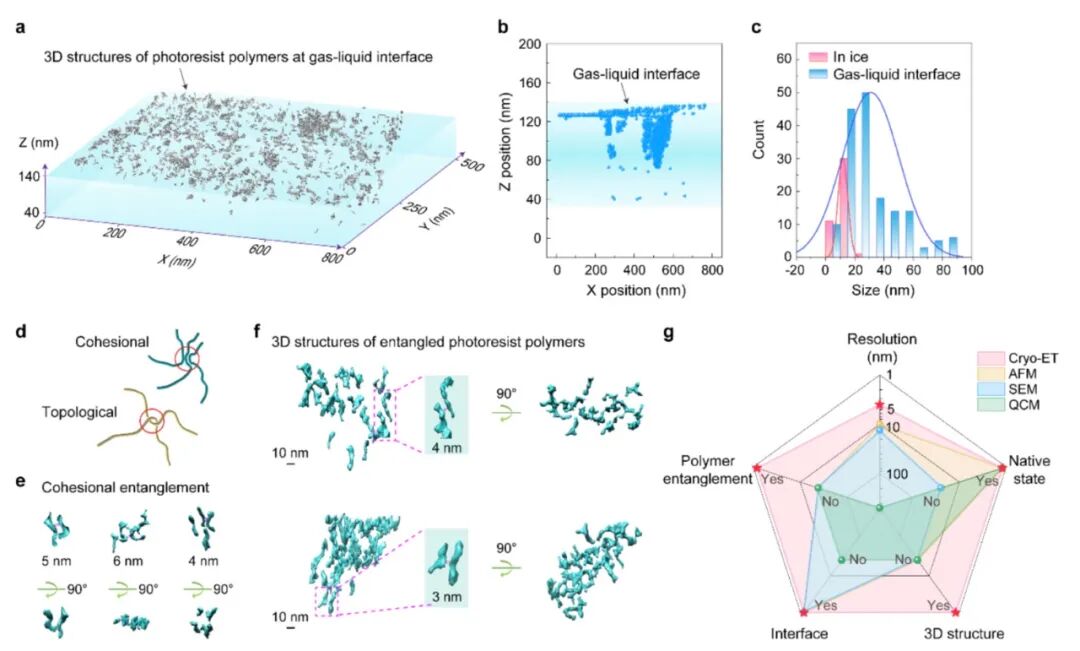 为破解难题,研究团队首次将冷冻电子断层扫描技术引入半导体领域。他们在晶圆上进行标准的光刻曝光后,将含有光刻胶聚合物的显影液快速吸取到电镜载网上,并在毫秒内将其急速冷冻至玻璃态,“定格”光刻胶在溶液中的真实状态。