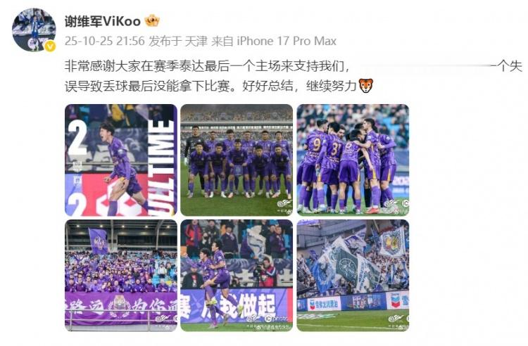 直播吧10月25日讯中超联赛第28轮,天津津门虎主场2-2绝平长春亚泰。赛后,为津门虎完成绝平的谢维军更新了个人社交媒体。