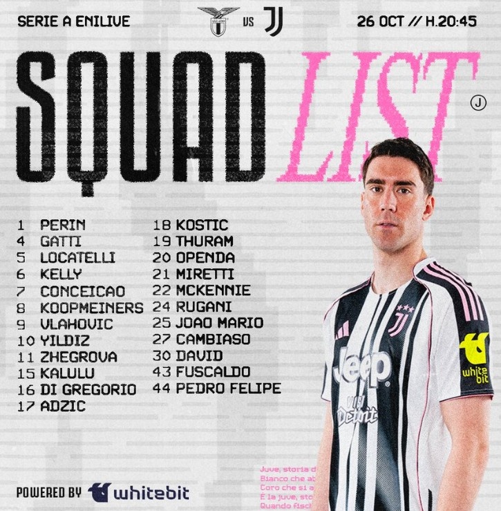 直播吧10月25日讯本轮意甲尤文将迎战拉齐奥,球队官方也公布了本场比赛大名单,具体如下: