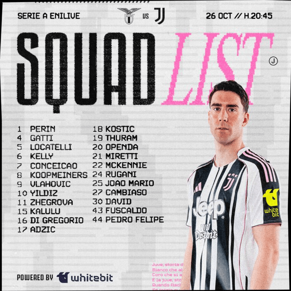 虎扑10月25日讯意甲联赛第八轮,尤文图斯将做客挑战拉齐奥。赛前,尤文官方公布了本场比赛的大名单。