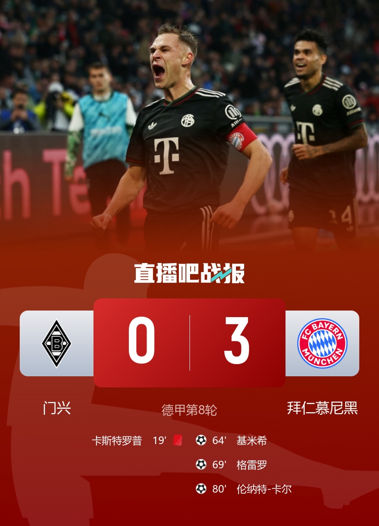 直播吧10月25日讯北京时间21:45,德甲第8轮门兴格拉德巴赫vs拜仁慕尼黑。上半场,迪亚斯开场失单刀;卡斯特罗普飞铲迪亚斯染红;于帕梅卡诺离谱手球染黄!下半场,凯恩破门因越位无效,随后基米希、格雷罗破门;比朔夫送点,斯托格点射击中立柱!17岁卡尔替补登场世界波锁定胜局!最终,拜仁3-0击败十人门兴,8连胜领跑德甲!门兴则8轮不胜继续垫底。
