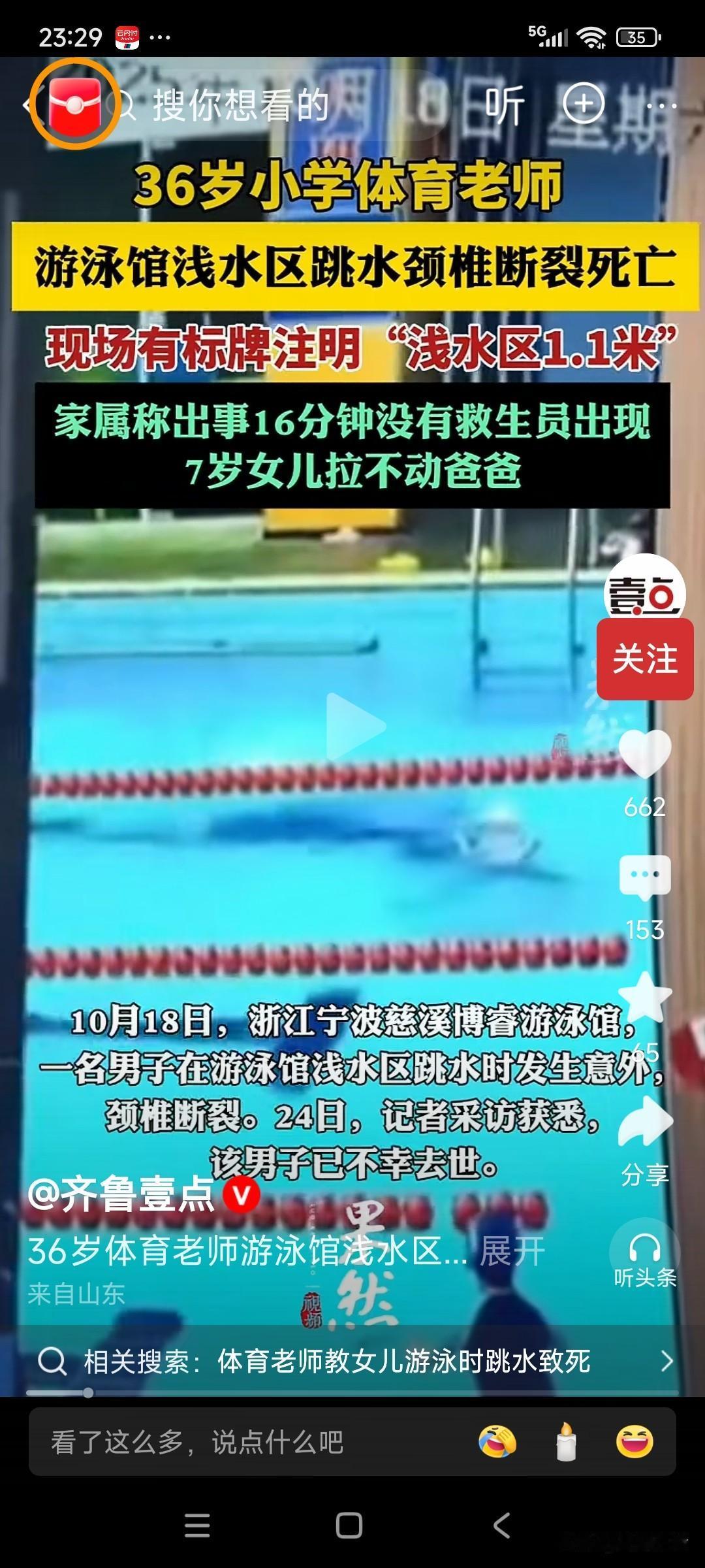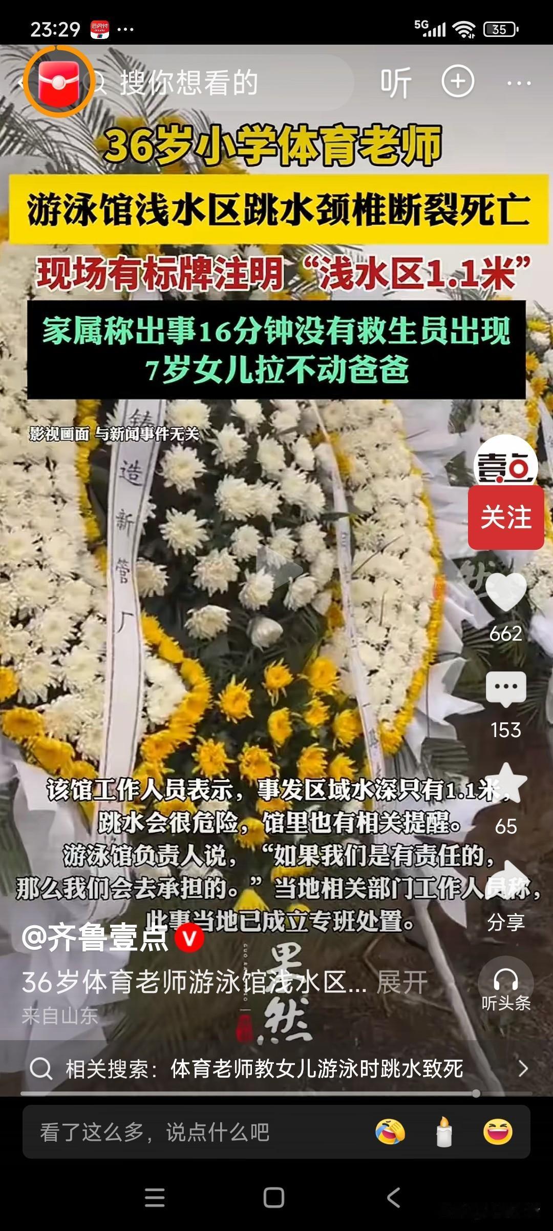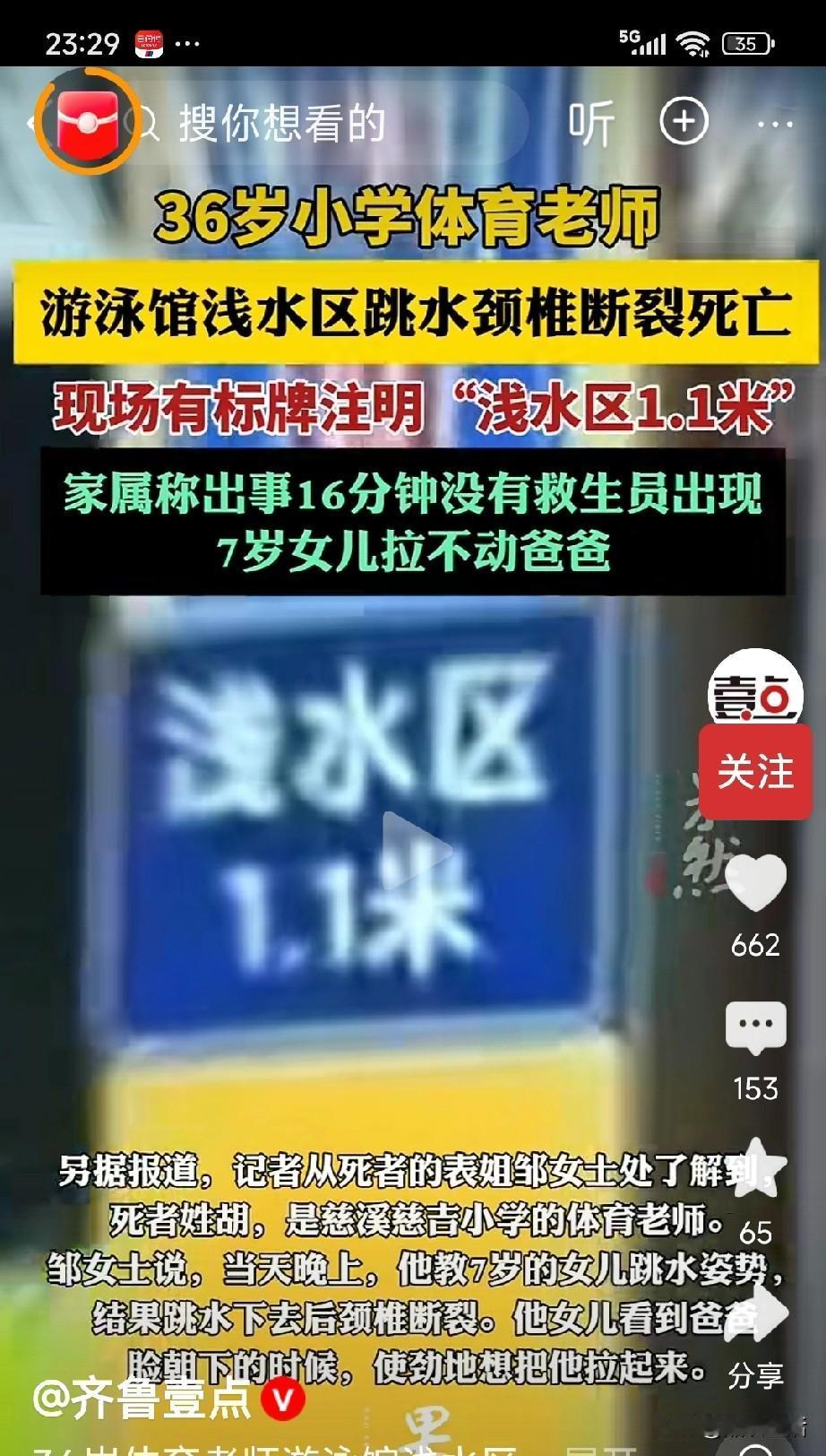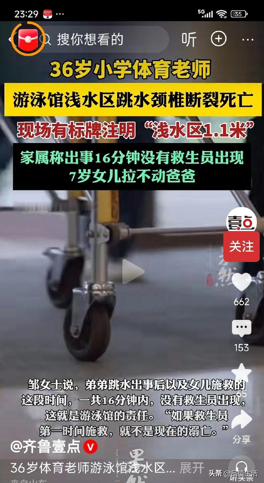 7岁的女儿,看到1.8米高的爸爸,头朝下,直直的“立”在水中,拽也拽不动!该多崩溃!她没有呼救,却花了16分钟,把妈妈叫来,这时候救生员才发现异常! 也因此,错过了,男人黄/金救援时间! 5天后,男人还是走了! 也难怪家属质疑,这么长时间,救生员都没有发现异常? 虽然询问过男子,但是在没有得到回应的情况下,救生员,不该“持续观察”,必要时施以援手吗! 游泳馆说,不会逃避责任! 但对于家庭来说,无法弥补,失去亲人和朋友的痛! 男子是体育老师,37岁了,1.8的身高,不知道泳池。1.1米浅水区的标签吗? 还是去过几次的泳馆, 真是阴差阳错了! 且行且珍惜!