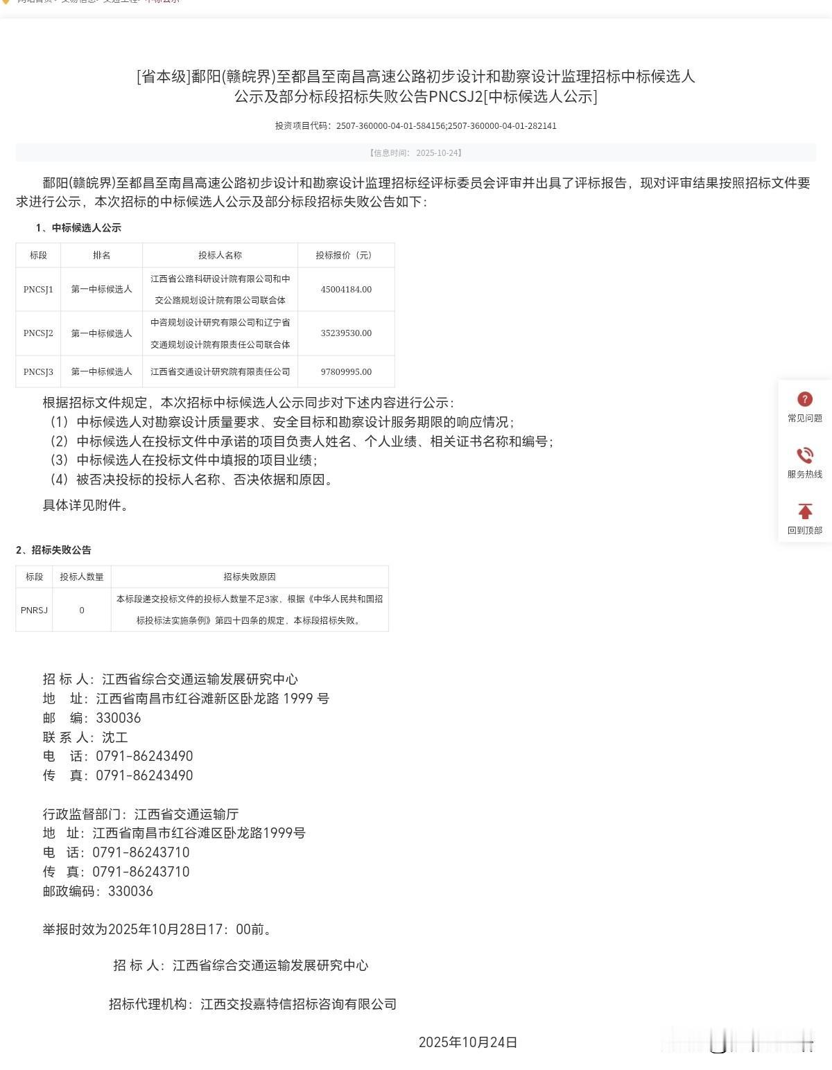 好消息,鄱都南高速公路新进展,中标候选人公示发布及最大标段招标失败。 近日,鄱阳(赣皖界)至都昌至南昌高速公路发布初步设计和勘察设计监理招标中标候选人公示及部分标段招标失败公告。 PNCSJ1标第一中标候选人为江西省公路科研设计院有限公司和中交公路规划设计院有限公司联合体,投标报价为45004184.00; PNCSJ2标第一中标候选人为中咨规划设计研究有限公司和辽宁省交通规划设计院有限责任公司联合体,投标报价为35239530元; PNCSJ3标第一中标候选人为江西省交通设计研究院有限责任公司,投标报价为97809995元; PNRSJ标段投标人数量不足3家,招标失败。 PNRSJ标段是鄱都南高速公路,最重要标段,可惜招标失败,这也将导致项目工期再一次延迟。