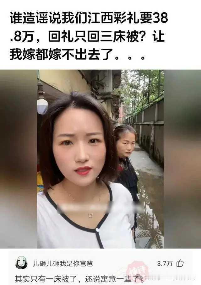 严重不对等的交换方式! 男娶妻,彩礼38万8000元。 而女方的陪嫁,仅是三床被