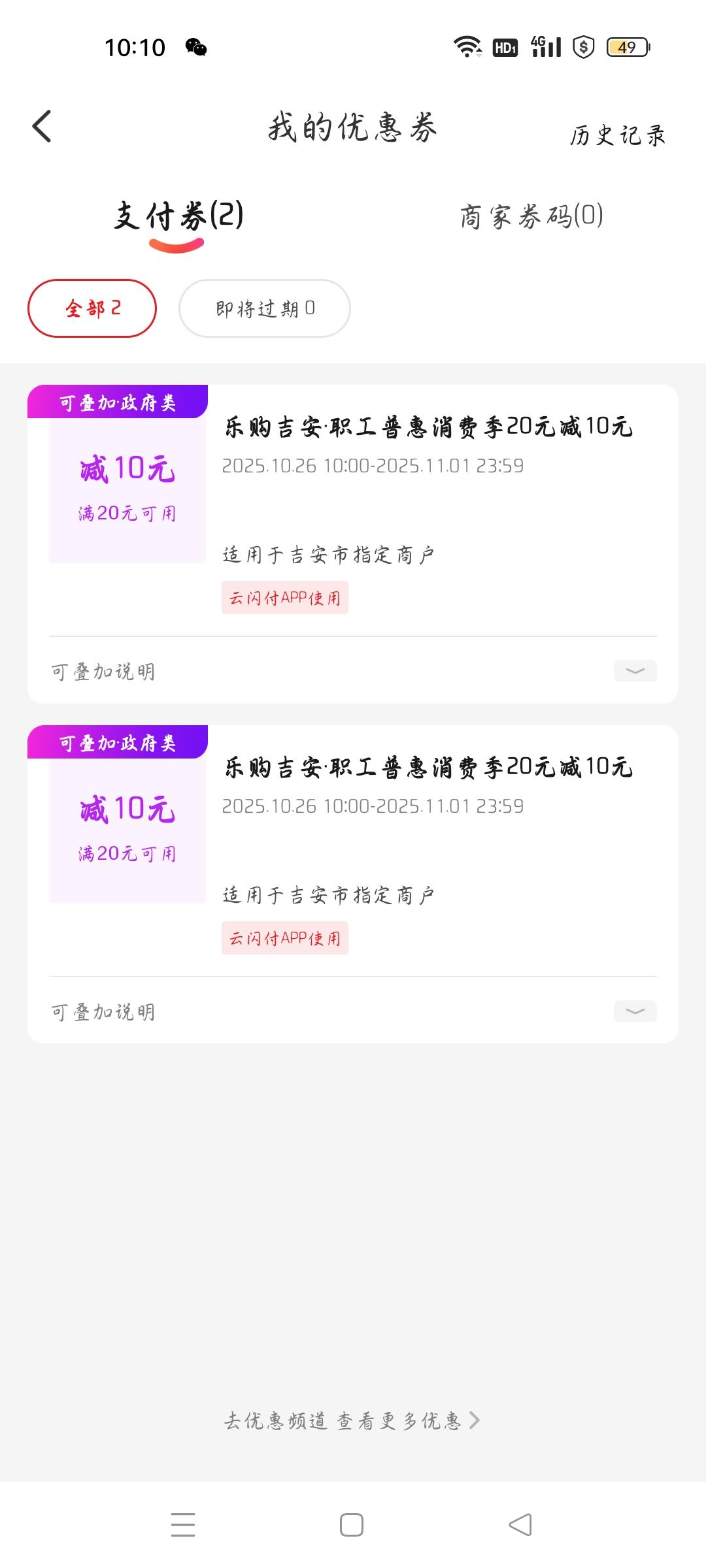 今天你抢到消费券了吗? 我们大江西总工会发福利了,发工会消费券,闹钟设好10点,10点开始抢券,我想抢50减30消费券,图案要验证重合,由于看不清,几次验证错误不到1分钟券抢完了,转而退其次,抢20减10券,图形看得清,一下子重合成功,接连抢了两张券。没有大收获,小有收获。有江西的条友,抢到了吗?欢迎分享。