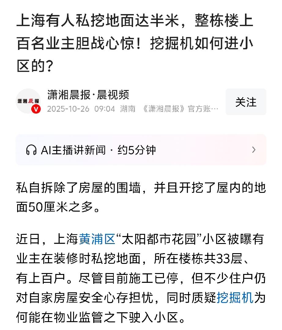 胆战心惊? 确实!太没有安全感了!上海有人私挖地面达半米,整栋楼上百名业主胆战心惊! 就是上海的地皮再怎么值钱也不能这么干。这个业主真是不懂法律,不考虑后果。 前几天安徽还是在哪里,不是也有这种类似的新闻吗?被刑拘了。 这是要构成犯罪的,好像是要构成以危险方法危害公共安全罪。不应该,确实不应该。