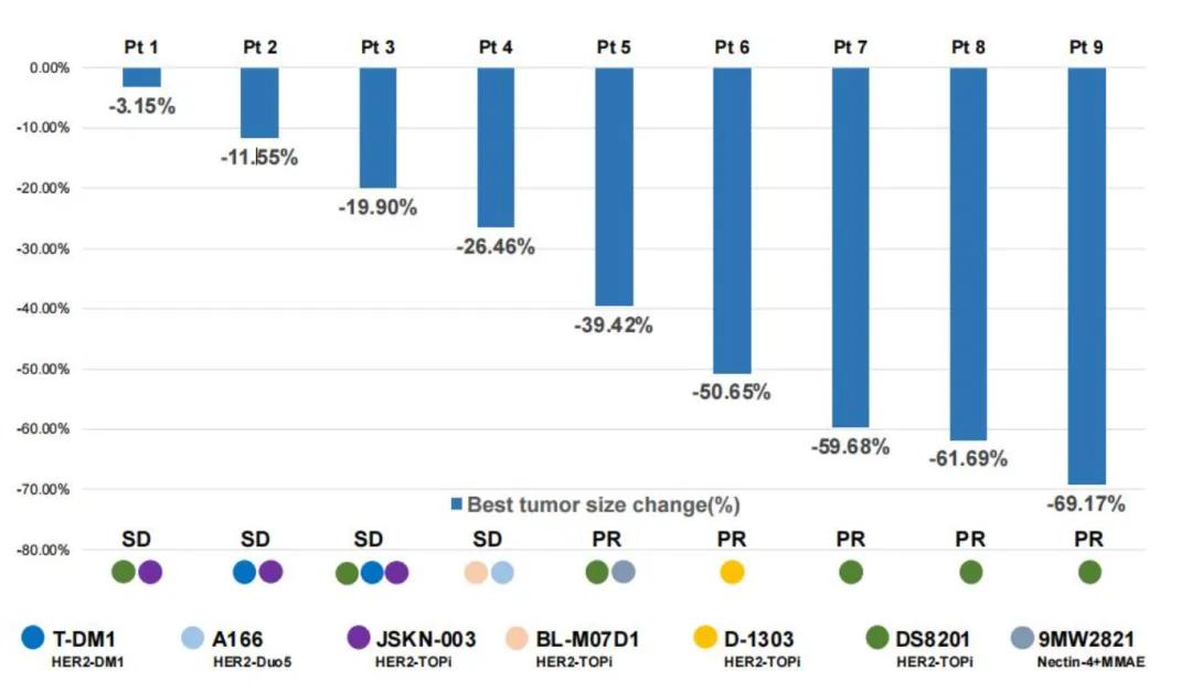 从患者疗效分析来看,SMP-656的这一策略在临床上是奏效的,试验一共入组9例经ADC治疗患者,其中3例既往仅接受过DS-8201作为唯一ADC治疗的患者均达到PR(ORR=100%);从其他接受过多款ADC治疗(不含DS8201)的患者来看,SMP-656对既往接受过同类载荷微管抑制剂ADC(如T-DM1、A166)治疗的患者疗效比较有限,而对于几位既往接受过载荷TOPi的ADC均展现出一定的疗效。