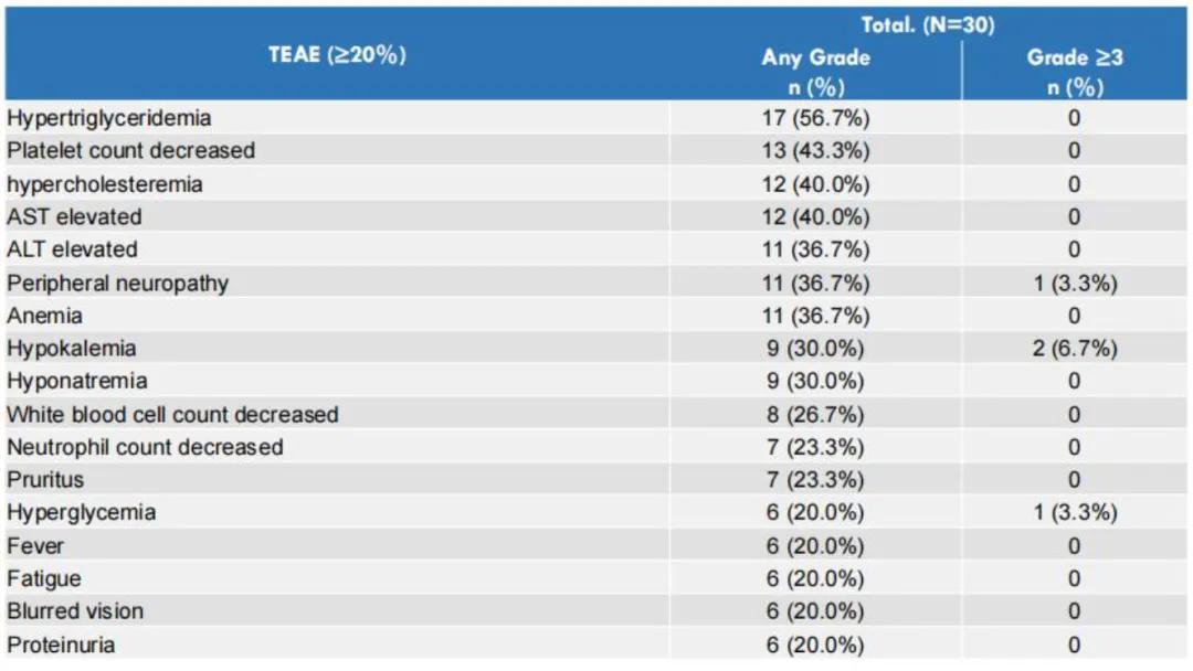 安全性方面,出现≥3级TEAE的患者有7例(23.3%),未出现导致治疗终止的不良事件,也没有出现间质性肺病等DS8201的常见副作用,其主要不良事件表现为心血管风险、肝毒性、皮肤毒性等,但大部分事件为1-2级,这可能也是该药物研究最高爬到2.5mg/kg的原因,不追求像DS8201那样的力大砖飞(三期标准推荐剂量为5.4mg/kg)。
