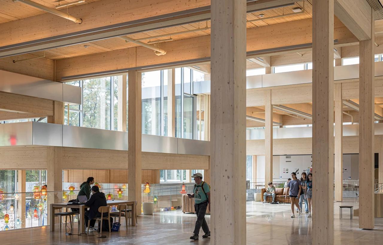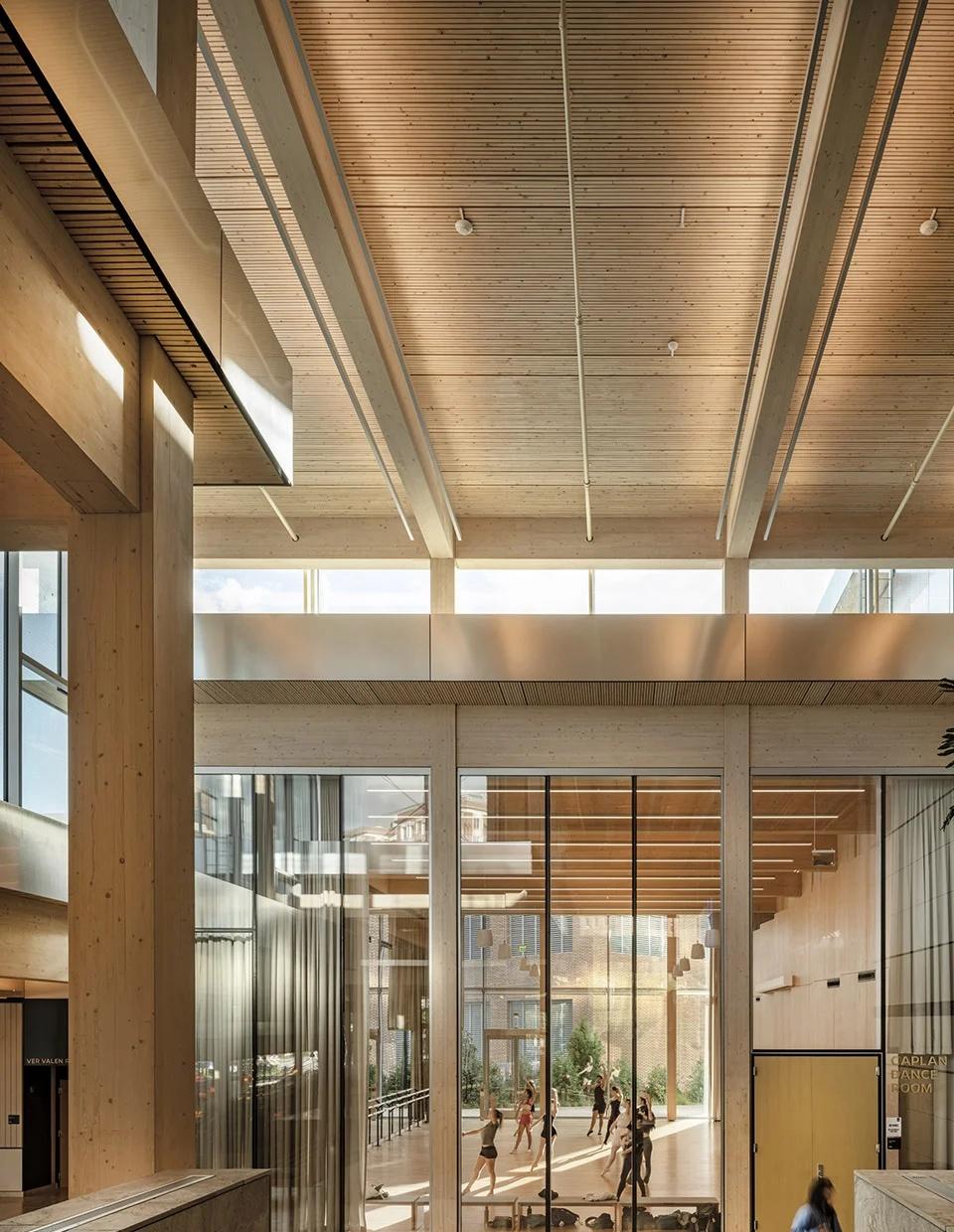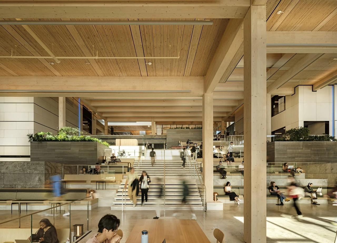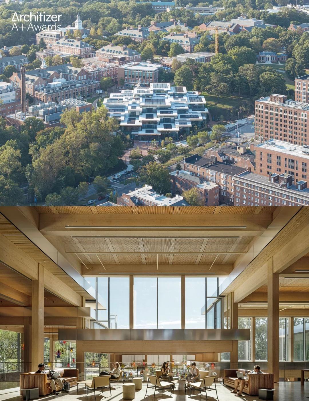 层叠木构与玻璃幕墙构建漂浮的校园生活村落 ▪️项目:克莱蒙特·麦肯纳学院(CMC)罗伯特·戴科学中心 ▪️公司:BIG ▪️摄影:laurianghinitoiu - ▪️该中心由 BIG 设计,建筑面积 15 万平方英尺,以 “学生生活村落” 为核心理念,打造校园新枢纽。设计深入研究学生需求,用层叠木结构亭阁、“森林” 般立柱群支撑 29 片悬浮屋顶,搭配玻璃幕墙模糊室内外界限,且四层均能从外部直接进入,强化可达性。 - ▪️屋顶近 1000 块光伏板供超半数用电,遵循《Living Building Challenge》红名单标准,冲刺 LEED 铂金级认证;中央 “创意共享中庭” 与主楼梯 “客厅” 为核心,四周分布多元功能区;木质结构降碳且营造温暖氛围,屋顶高窗与挑檐设计平衡采光与遮阳。 - ▪️建筑还连通校园与查尔斯村,外围环形砖台阶衔接绿地,铺地图案串联校园历史与当下,重新定义校园入口,推动可持续与社区融合。 - @创作助手 @REDesign @艺术薯 @设计薯 - Architizer 建筑设计 开源城市计划 现代木结构 可持续建筑设计 校园生活 大学校园