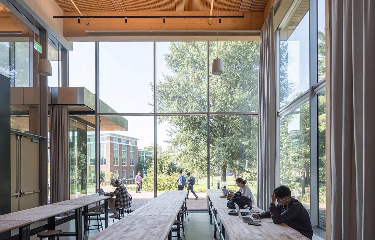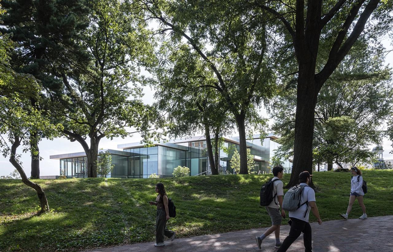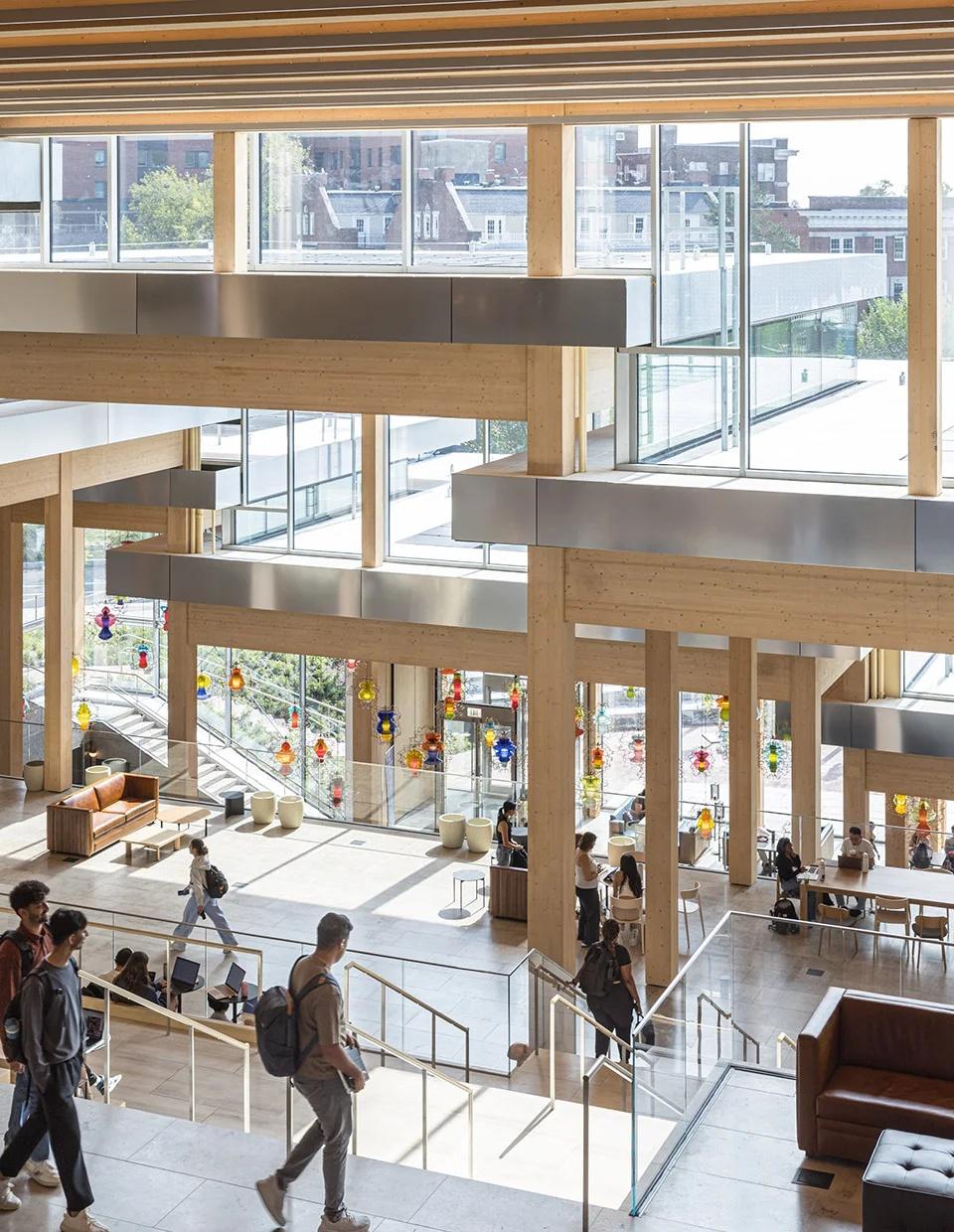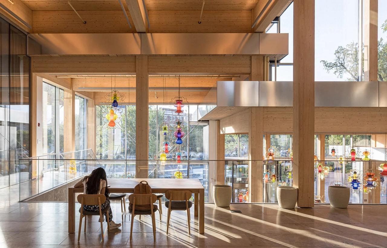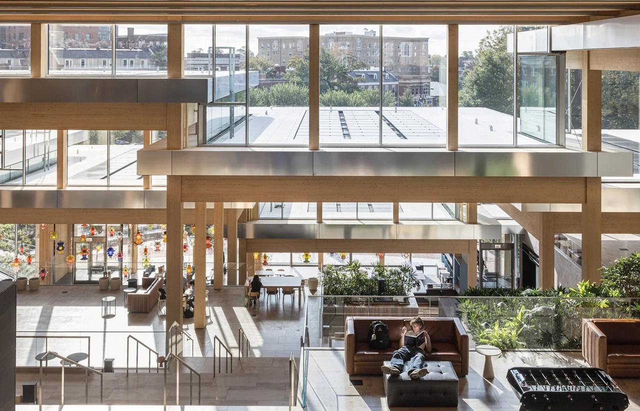 层叠木构与玻璃幕墙构建漂浮的校园生活村落 ▪️项目:克莱蒙特·麦肯纳学院(CMC)罗伯特·戴科学中心 ▪️公司:BIG ▪️摄影:laurianghinitoiu - ▪️该中心由 BIG 设计,建筑面积 15 万平方英尺,以 “学生生活村落” 为核心理念,打造校园新枢纽。设计深入研究学生需求,用层叠木结构亭阁、“森林” 般立柱群支撑 29 片悬浮屋顶,搭配玻璃幕墙模糊室内外界限,且四层均能从外部直接进入,强化可达性。 - ▪️屋顶近 1000 块光伏板供超半数用电,遵循《Living Building Challenge》红名单标准,冲刺 LEED 铂金级认证;中央 “创意共享中庭” 与主楼梯 “客厅” 为核心,四周分布多元功能区;木质结构降碳且营造温暖氛围,屋顶高窗与挑檐设计平衡采光与遮阳。 - ▪️建筑还连通校园与查尔斯村,外围环形砖台阶衔接绿地,铺地图案串联校园历史与当下,重新定义校园入口,推动可持续与社区融合。 - @创作助手 @REDesign @艺术薯 @设计薯 - Architizer 建筑设计 开源城市计划 现代木结构 可持续建筑设计 校园生活 大学校园