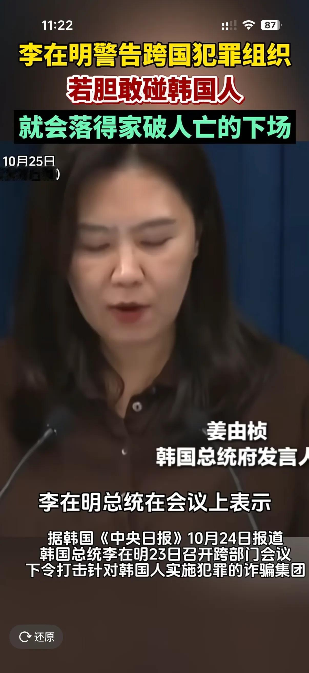 韩国总统李在明在新闻会上发表声明,警告东南亚的的诈骗犯罪组织,如果敢动韩国人,那么就会让你家破人亡,说实话,这要搁以前,这些诈骗集团绝对会把这当个笑话看! 甚至有的诈骗犯罪集团还会特意向韩国人下手! 可是现在不一样了,估计东南亚的战片犯罪集团恨不得赶紧把在自己手上的韩国人赶紧送走! 实在是这次韩国的杀鸡儆猴做的太彻底了! 前一阵韩国22岁大学生在柬埔寨遭诈骗犯拘禁致死,直接惹怒韩国,韩国直接和其他国家合作快速的摧毁诈骗犯所在园区,可以说反应速度极快了! 现在前车之鉴在前,恐怕短时间之内东南亚的诈骗犯罪集团是真的不敢轻易触碰韩国人了!