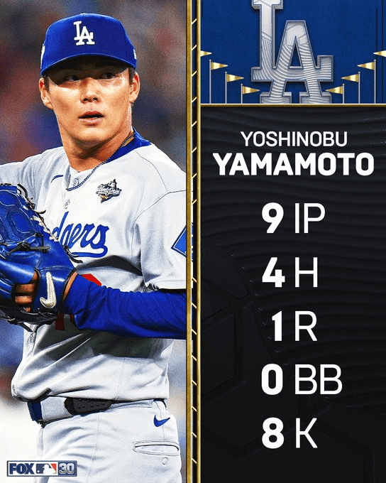 全场比赛,道奇队先发投手山本由伸投满9局,8次让蓝鸟打手三振出局,0次四坏球保送,仅被敲中4个安打拿下1分。