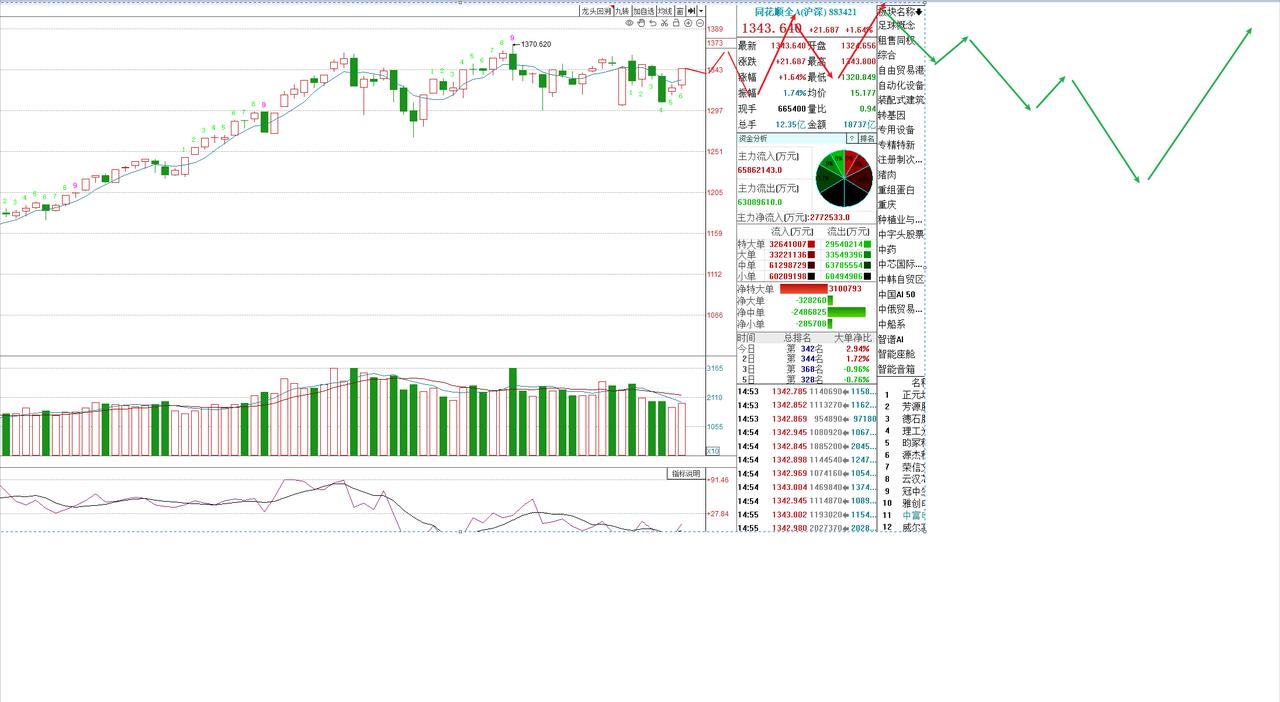 现在一定要注意科技股的高抛。现在科技股的很多根本没有买点。 如果我把后面的走势图补全,那就理解为何要远离前期的强势板块和强势股。 下周反抽反弹结束,进入调整,调整最好不要新低,我更倾向于不会新低。 所以就以不创新低画。见底后后面波动将会变的更大,板块分化更剧烈,资金大概率以防守板块为主。 整体而言,后续会有一波明显的像样的调整。所以后续红色两波上涨不要上头,都是当做诱多处理的。