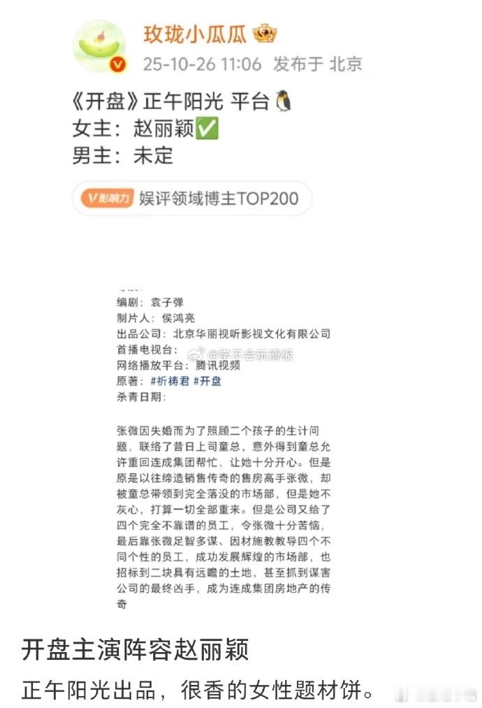 赵丽颖或将出演正午阳光开盘 ​网传赵丽颖正午阳光二搭房地产题材大剧《开盘》网传女主赵丽颖。来看班底阵容。大家看好吗?